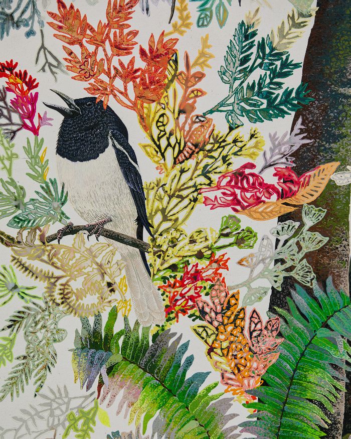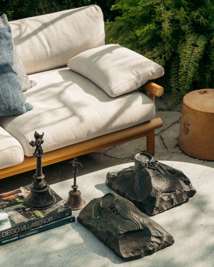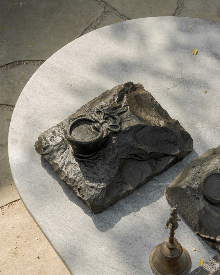 “Creativity can’t be compartmentalised, it’s important to look outside the boxes we put ourselves in,” insists Maniar. As if in reciprocal fervour, to celebrate World Landscape Architecture month in April, he invited seven of his maverick artist friends to respond to a garden he designed in Alibaug, a quaint coastal town South of Mumbai. That the site brimmed with cross-disciplinary conversations and collaborations was only to be expected. The resultant output showcases diverse expressions in materials as varied as textile art, basalt stone, ink on paper, precious stones, and even pastry!