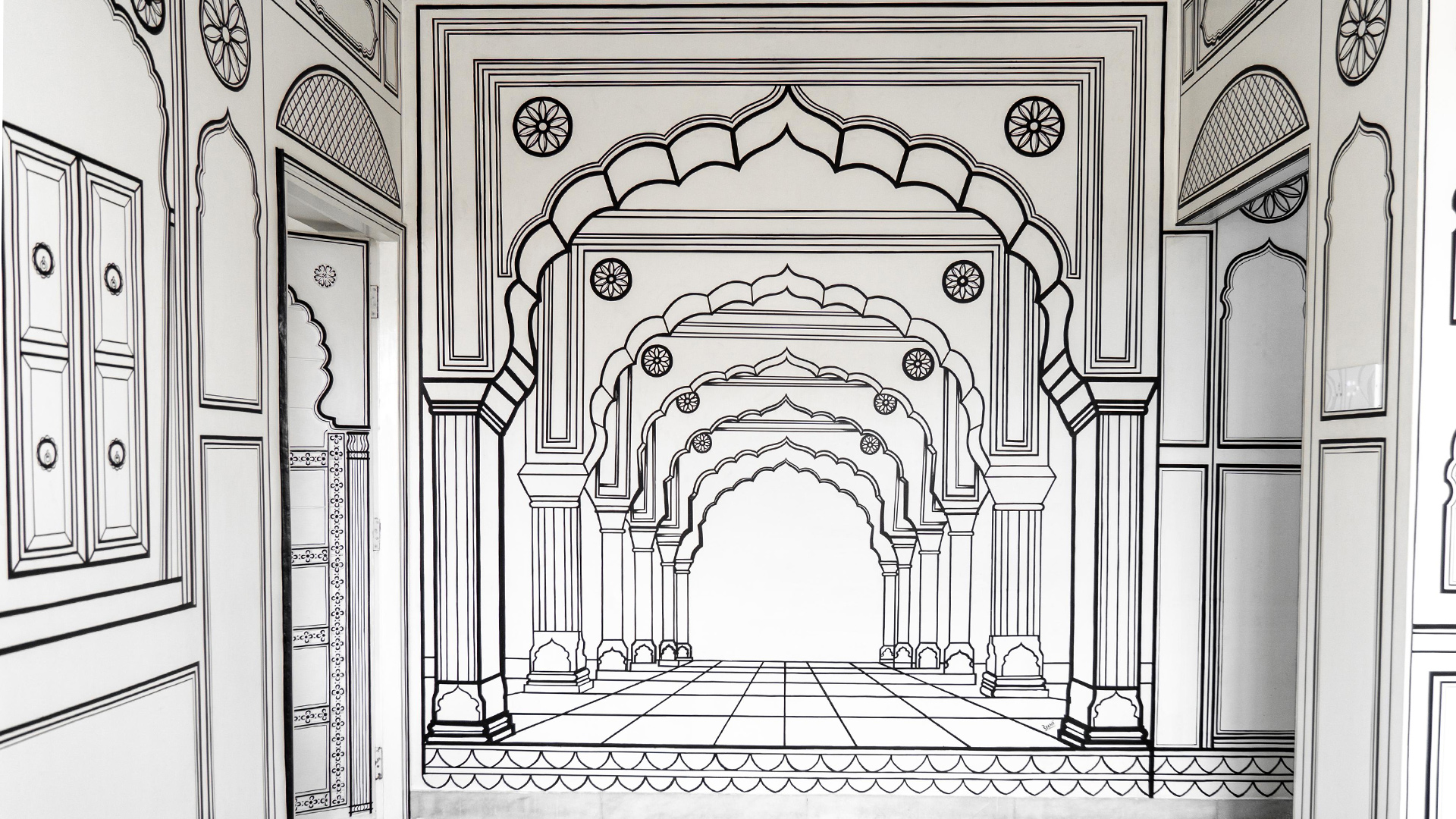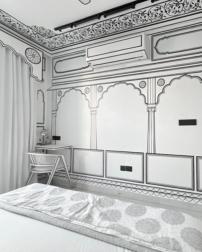 Lalluji Luxe unfolds across multiple one, two and three-bedroom suites, each conceived as an extension of your Jaipur sojourn, except that stepping indoors feels like entering a brand new colouring book brought vividly to life. Whimsical but never flippant, the suites embrace a monochromatic reading of the city, with hand-painted walls drawing from pichwai iconography and Rajasthani miniature fresco techniques, reinterpreted through a graphic, black-and-white lens. Reading nooks and balconies fill the spaces with soft shafts of daylight, particularly during the golden hour, when the interplay of light and line lends the interiors a surreal quality. Those who wish to spend their time in the city working from home can also find desks within their suites. Thoughtful comforts complete the experience: warm, home-cooked Rajasthani meals served in-suite, a fully-equipped kitchenette and Alexa-enabled controls that let you adjust lighting, fans, curtains, sheers and entertainment with effortless ease. This proves that even a sketch can be smartly finished.