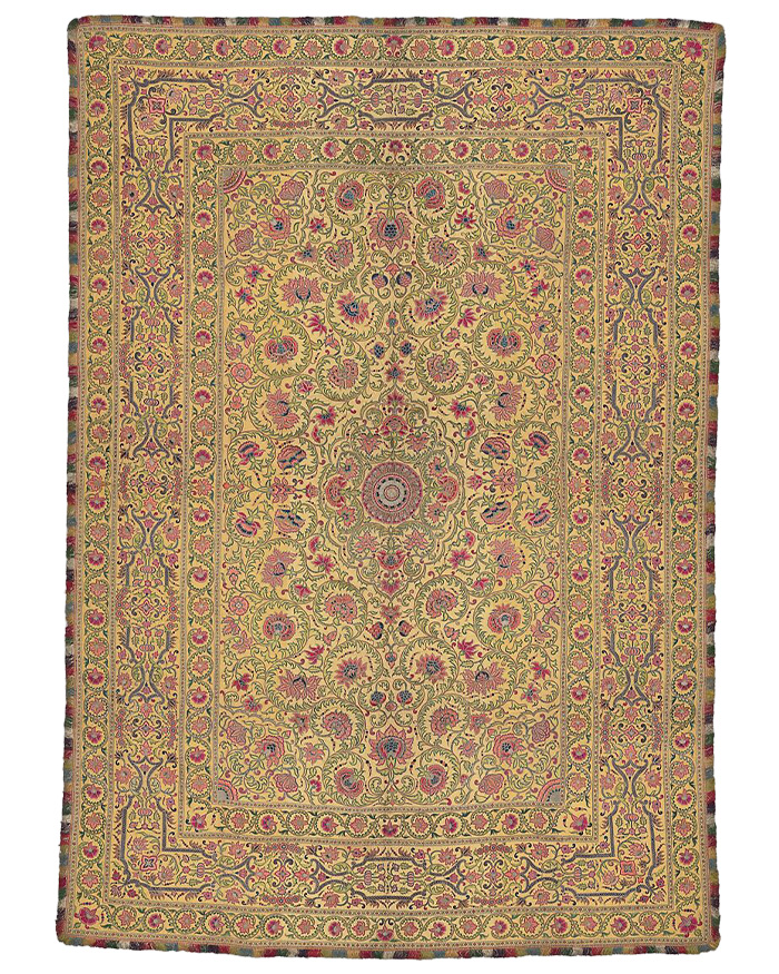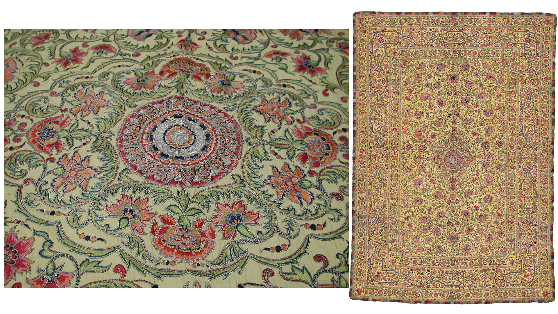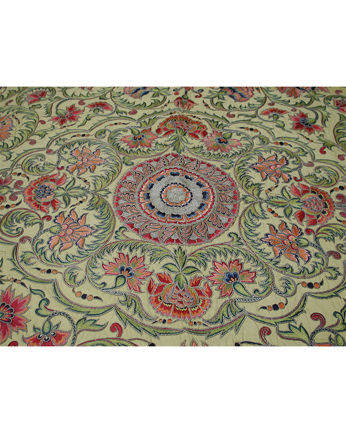 It is within this larger web of exchange, conflict and patronage that one particular lineage of embroidery was stitched into being. As founders of a Chennai-based embroidery atelier, whose artisans have lived in the surrounding villages and practised their craft as a continuous tradition for more than 400 years, we have often asked ourselves about their heritage. With no written records on the subject from that time, our chance encounter with embroidered textiles categorised as Medallion embroideries from museum collections, in telling the story of their provenance, unveiled some of the mystery. And would place our craftsmen as descendants of artisans of the kharkanas of the Deccan courts. One of the most outstanding examples from the Victoria and Albert Museum is said to have belonged to Tipu Sultan. It is a densely embroidered cloth featuring a central medallion from which four flowering trees are spread, each corner bearing a quarter medallion, framed by a floral border with cavorting animals, itself flanked by narrow guard borders.