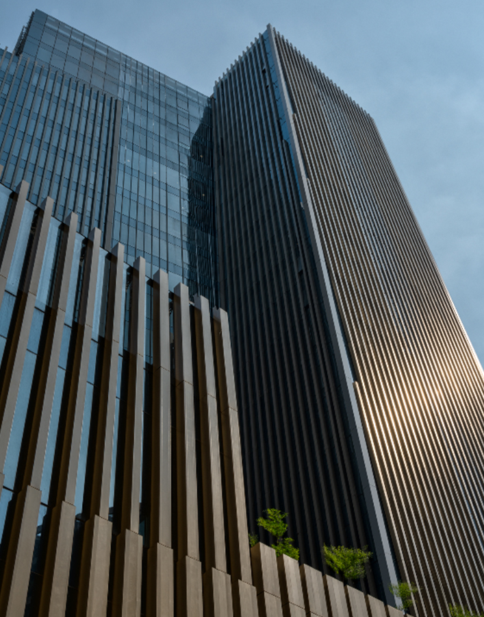 With a restrained colour palette, the real hero of this structure is its rich veneer and limestone detailing seen in the lobby that perfectly enhance the neutral tones and warm lighting. On the outside, the facade captivates you with its unique form and engineering that allows panoramic views and lets in the right amount of light, making this structure highly efficient in terms of energy usage. The triple-height lobby and the vista to the courtyard on entry were anchor points for the building’s design experience.