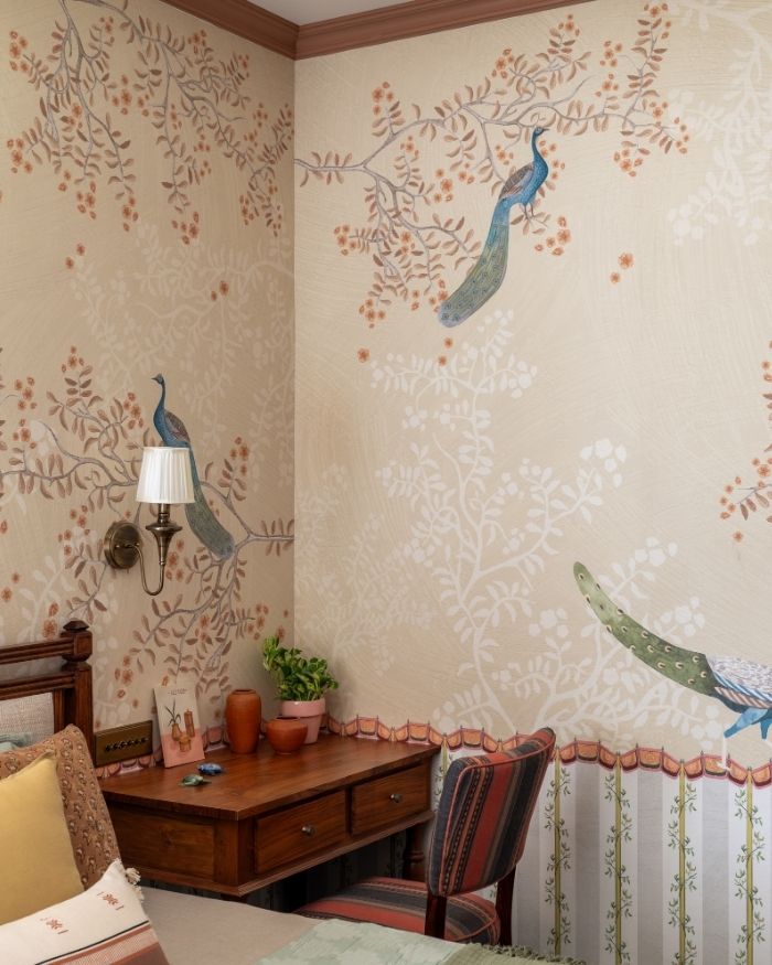“We worked virtually for months, piecing together fabrics, flooring, art and furniture. We then pulled it all together quickly, so that my client in her last trimester, could see her second home before returning to her hometown,” reveals Purva. The homeowner, Sahithya, knew exactly what she wanted. “A maximalist home that carried everything we do best at Attirail: colour, print, layered emotion, but with a distinctly South Indian twist,” adds Purva.