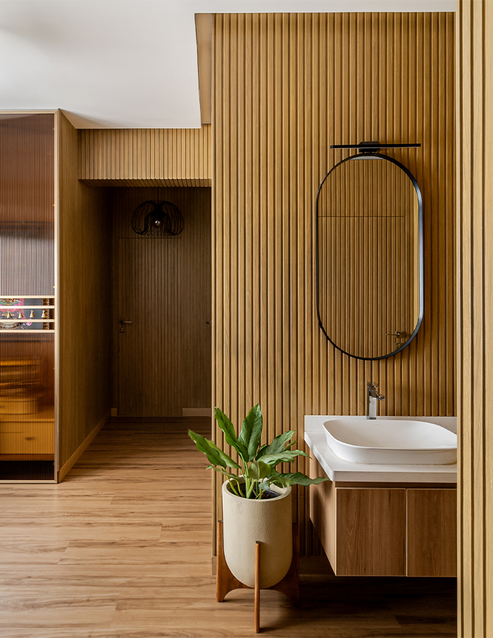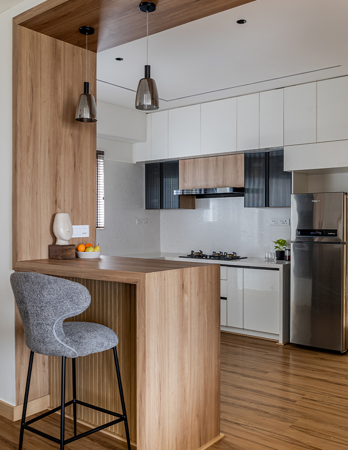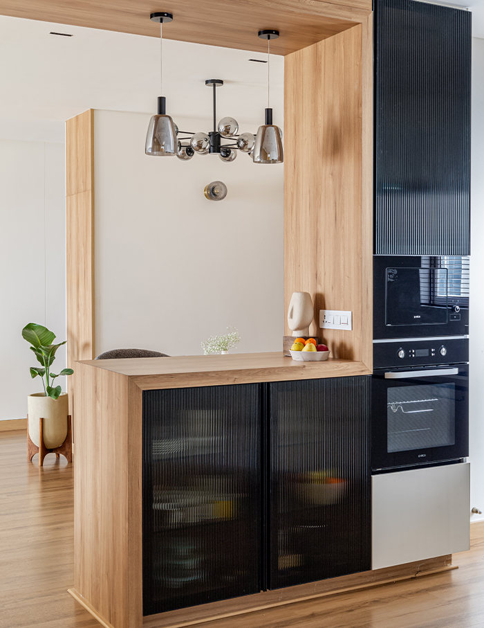 The excitement of coming home is unmatched – especially at this Bengaluru abode that embraces you with an inviting calm, gently drawing you into its folds. A space that exemplifies a timeless charm, where design transcends fleeting trends to create an earthy hued sanctuary. Principal architect Sujitha Chandrasekharan of LAB9 Design imagined this minimalist home with fluted oakwood panelling, interspersed with black and white hues.