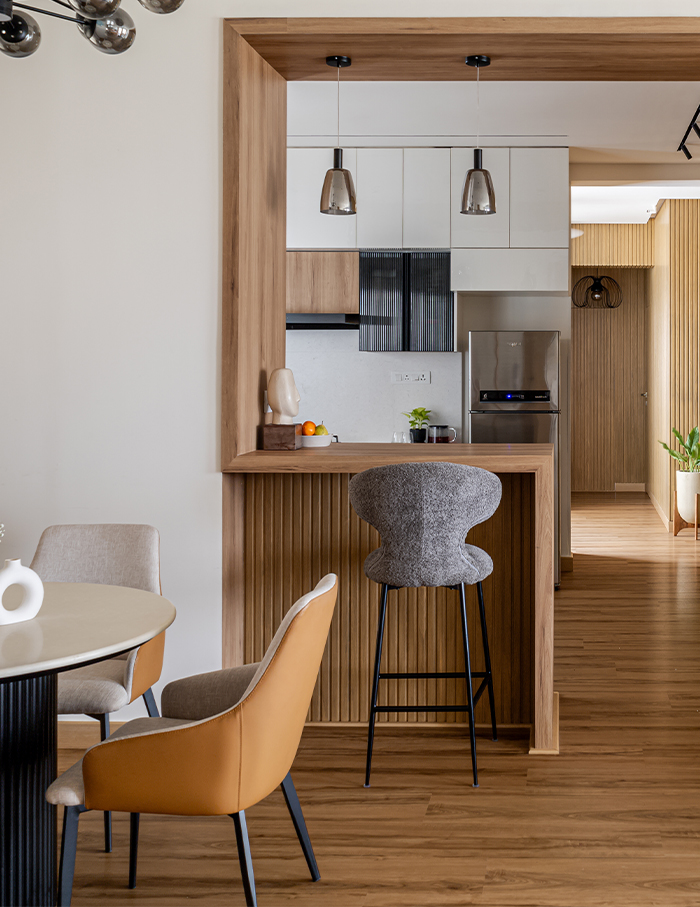 This openness spills onto the dining room, extending into a sleek kitchen showcasing off-white cabinetry and tinted fluted glass. The highlight of the kitchen is the breakfast counter with its unique portal-like extension from wall to ceiling that offers a constant revelation of the origins and patterns shaping the fluid narrative of the home.