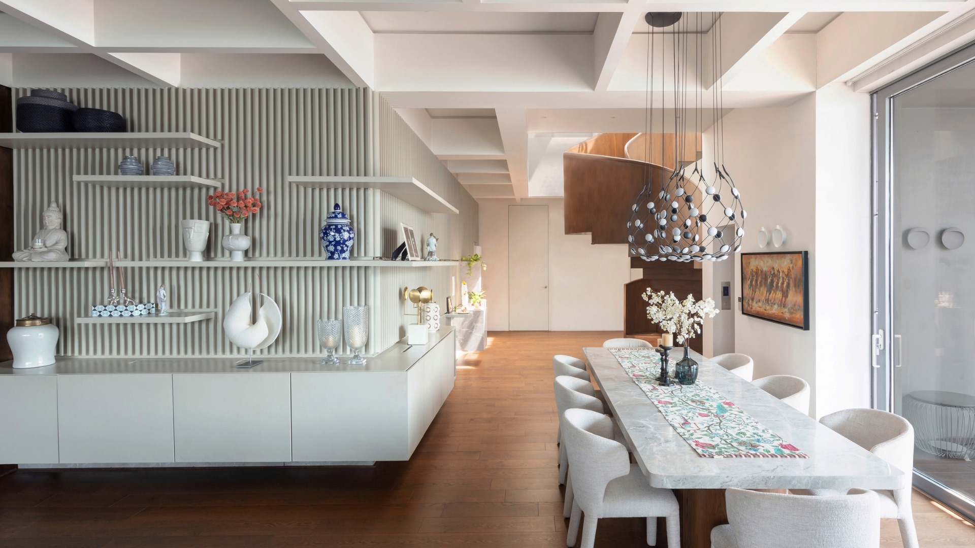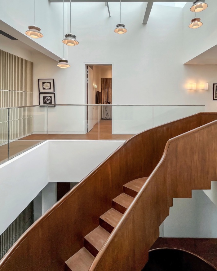 Reminiscent of a New York address you’re likely to see in Sex and the City, the home embraces penthouse living with an armful of whites and contemporary silhouettes. A conjoined living and dining space rest at its heart, lit up by the generously sized atrium and skylight filtering in light from above. Fluted panels, wooden accents and the slightest pops of colour add texture and character to the interiors. But the true piece de resistance? A floating staircase curves in the middle, helping one navigate the space from one floor to the other. The penthouses’ verticality is further enhanced owing to these design interventions.