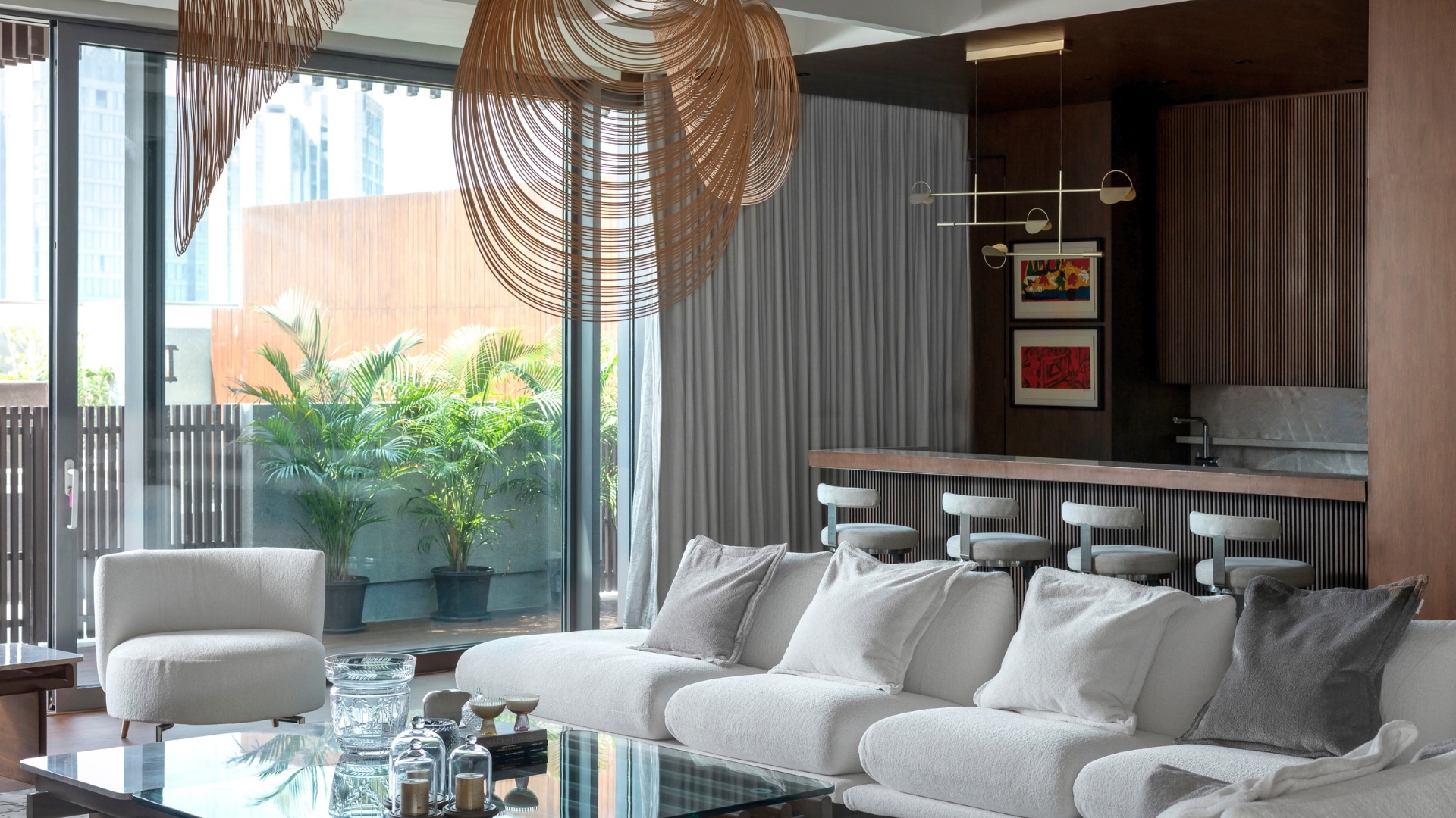 The home pairs neutrals with statement lights and plush seating, lit by windows by Schueco; Photography by Bajirao Pawar