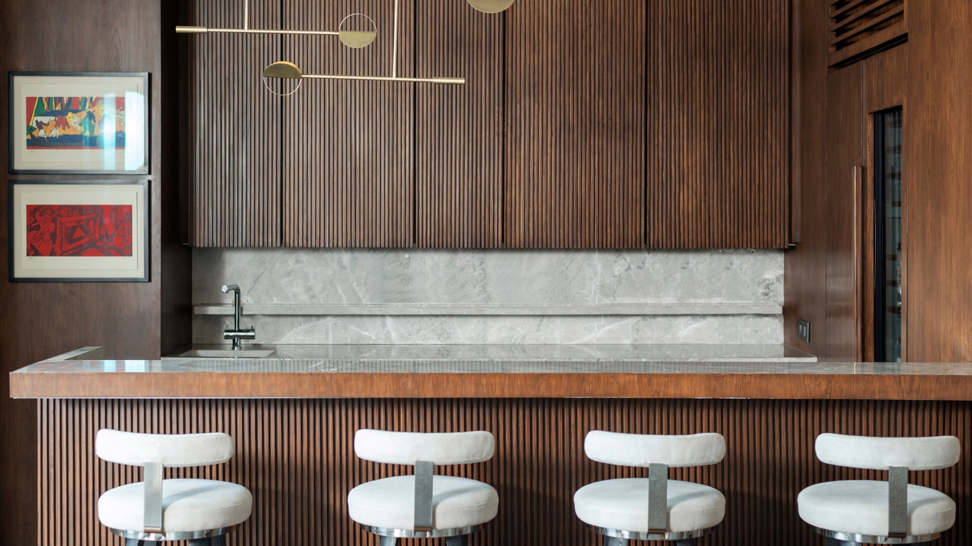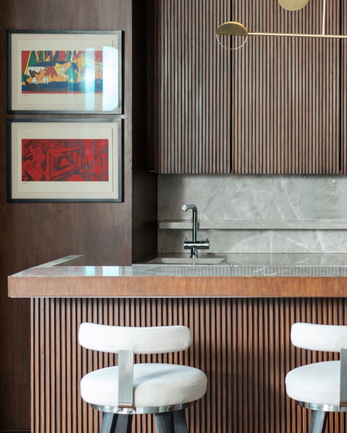 Natural stone by Nitco pairs beautifully with the fluted wood veneers by Jalaram Timber; Photography by Bajirao Pawar
