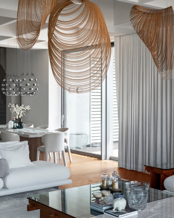 The home houses decorative light fixtures from Louis Poulsen, Foscarini, Luceplan, Davide Groppi, Ingo Maurer, Gubi, Vibia, Artemide, And Tradition and Bolia; Photography by Bajirao Pawar