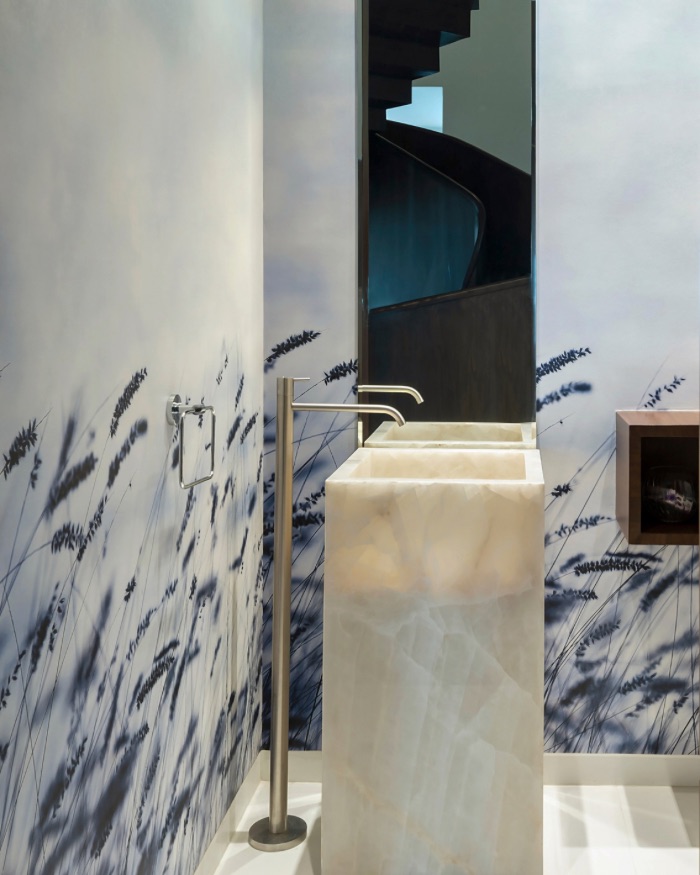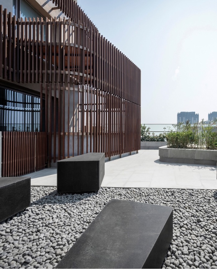 The terrace may leave you breathless for more reasons than taking the stairs. Appearing as if it were a third space disjunct from the home, this sprawling space is home to lush flowering beds, a fountain and a catering area for those who wish to pair their entrees with Mumbai’s revitalising sea breeze. Smaller seating zones allow you to perch and take in the view from multiple angles. It is here where the vertical composite bamboo slats, the home’s “second skin”, appear most prominently. Affixed to a stainless steel frame, their long, linear lines create a shaded dining and lounge area that is privy to slants of the sun coming through at all times, almost appearing to move to the rhythm of the sun. An added bonus? The vertical slats help reduce the amount of heat that enters the home. A true win-win!