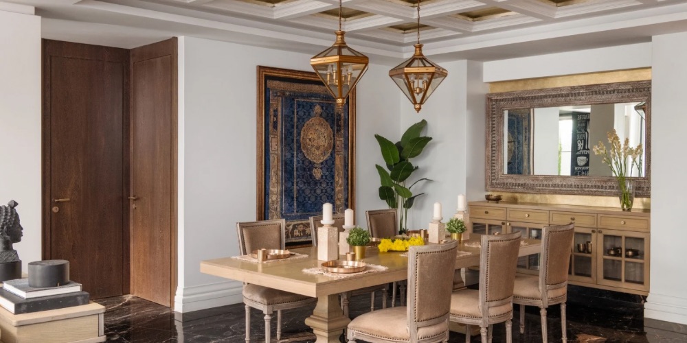 What began as a blank canvas, devoid of walls and adornment has metamorphosed into a resplendent adobe full of light and life. Picture a London townhouse dressed to the nines for a Bollywood bash — a Tarun Tahiliani-designed rug from Obeetee adorning an earthy dining room wall, a mini grand piano nestled beside the staircase, a coffered ceiling and classic chandelier suspended above the living room– every element is elegant with a daring sense of modernity.