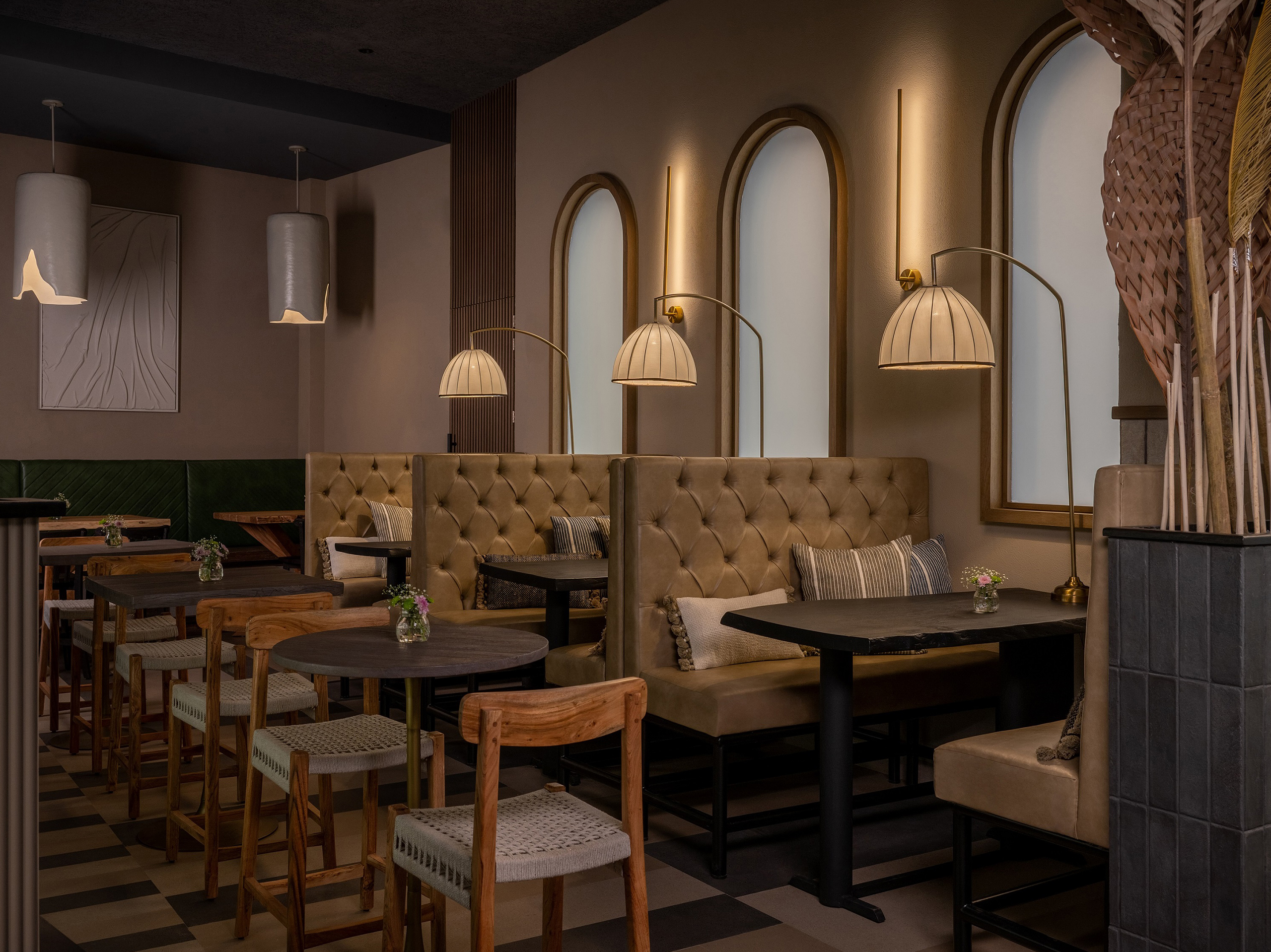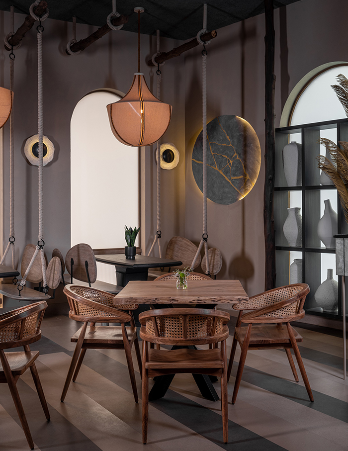 Lean, arched windows on the other side of the restaurant draw attention, in company of playful swing seaters crafted with rope suspensions and black grained sandblasted tables. In Tejal’s words, this is a back to basic glam version of living in raw nature — and, we see no point in disagreeing here.