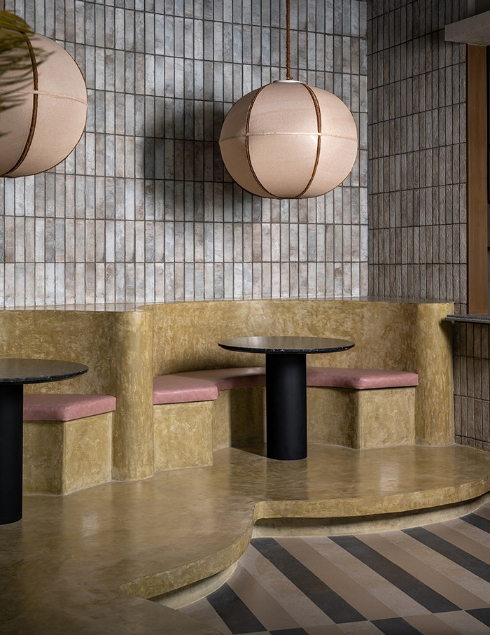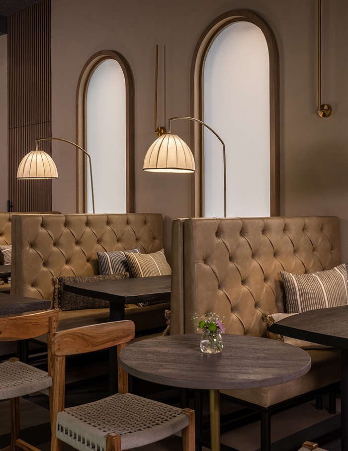 Promenading towards the restaurant, soft arches and straight lines converge on a cold, polished canvas, conveying the designer’s mood board of making the facade look like an inviting, dimly lit cave.