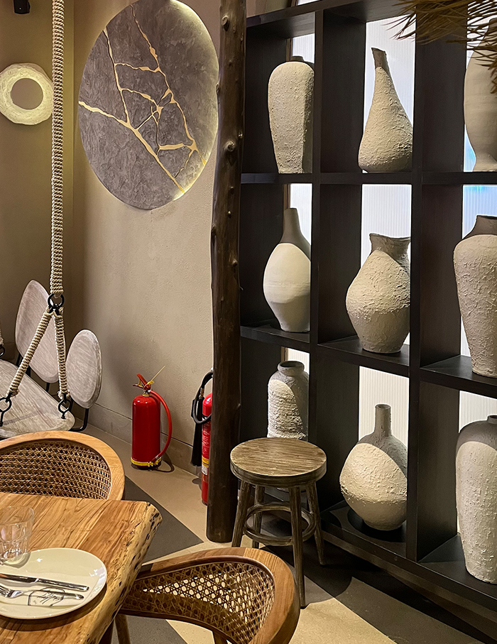 A crinkled, pure white artwork dresses up one of the walls, while shelves bear the aesthetic weights of amorphous, mottled pottery, flanked with a surprising addition of a floor-to-ceiling raw bark and sprinkles of dry fronds and matted leaves that elevate the natural mood of the space.