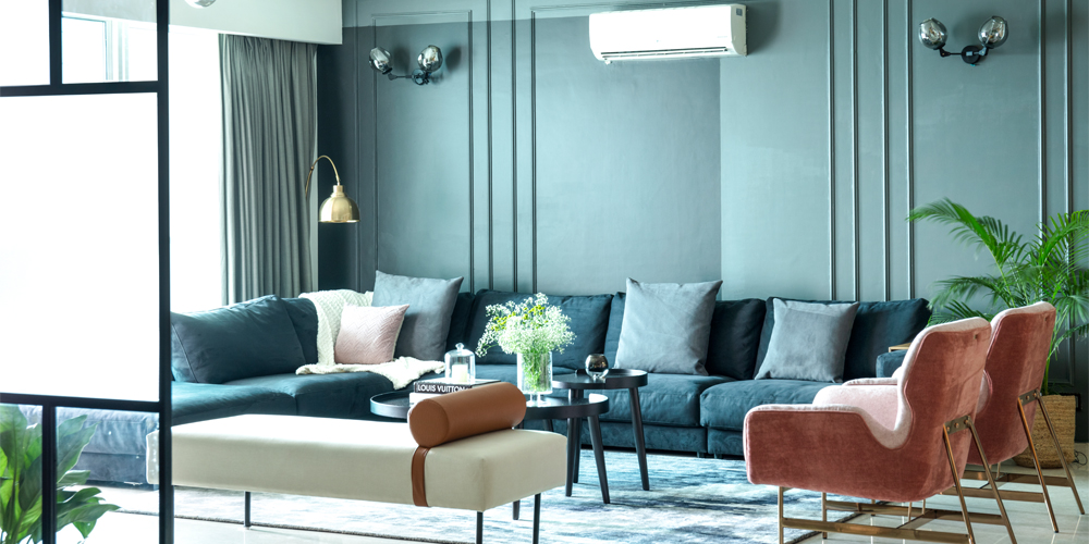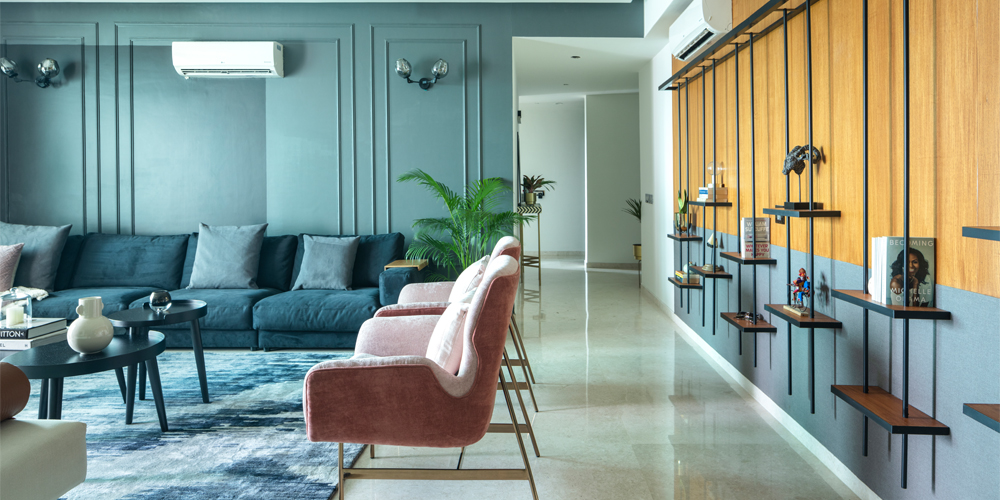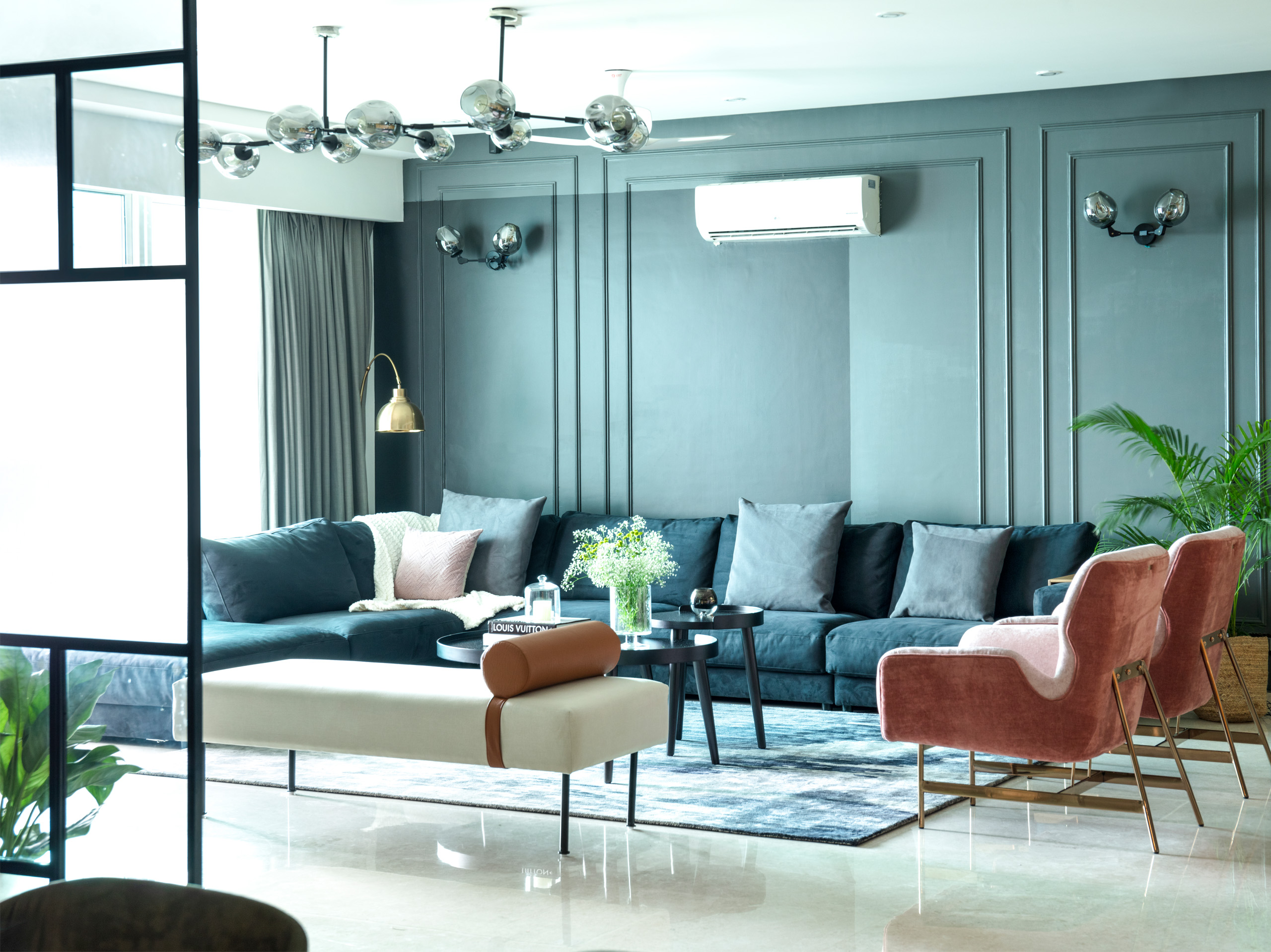 The entire house is dressed in blues and greys, paired with splashes of pink, green and monochrome. The distinctive yet complementing salmon-coloured armchairs from Bent Chair render a soft, romantic charm to the living space. Adding a sense of warmth are oak veneers that are finished in walnut polish, planters, poly-blend cotton and suede furnishings as well as the wall panelling.