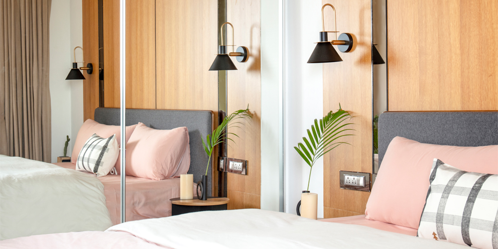 The other guest room also features a Godrej Script ensemble of fabric bed and sleek side tables against a mildly textured grey NGC Nafees wallpaper and unique wall lights.
