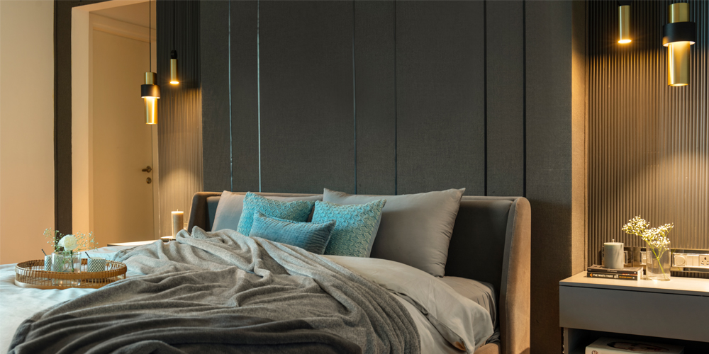 Our next stop is the master bedroom. Here, a smoky grey fabric back panel with black aluminium inlays, MDF grooves and dark grey glass panels are paired with contrasting white walls.
