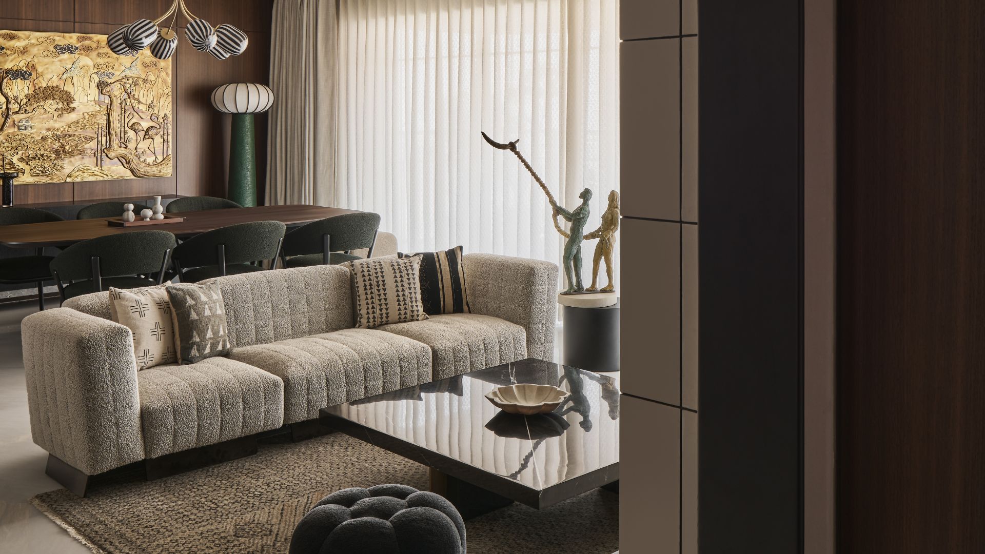 To maintain that sense of calm in the home, an earthy, neutral palette; think, warm beiges, soft browns and muted greens encompass you as you enter the living room. To break the monotony, subtle blues are sporadically found across the space, inspired by natural landscapes. “From the first walkthrough, we envisioned a space that told their story through materials, memories, and moments, each corner a chapter of where they’ve been and what they cherish,” say Yash and Parth Jhawar