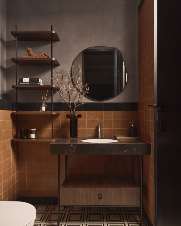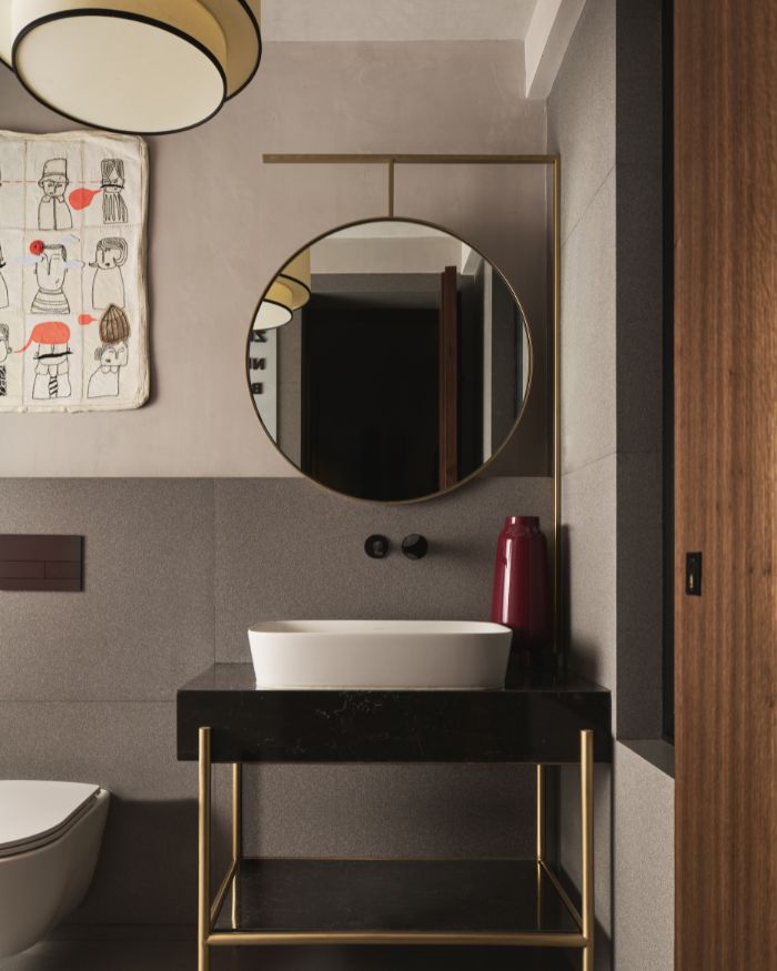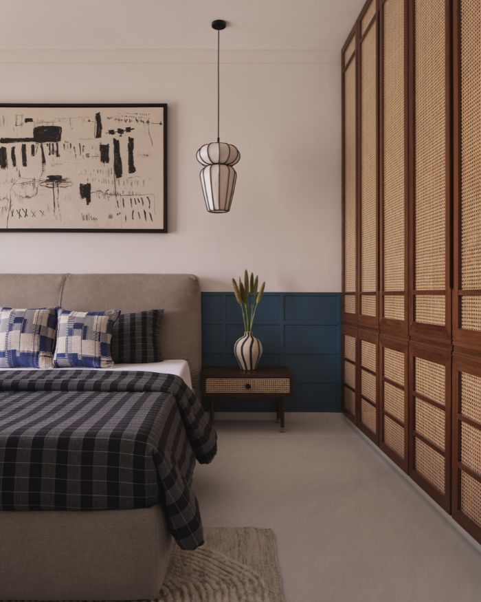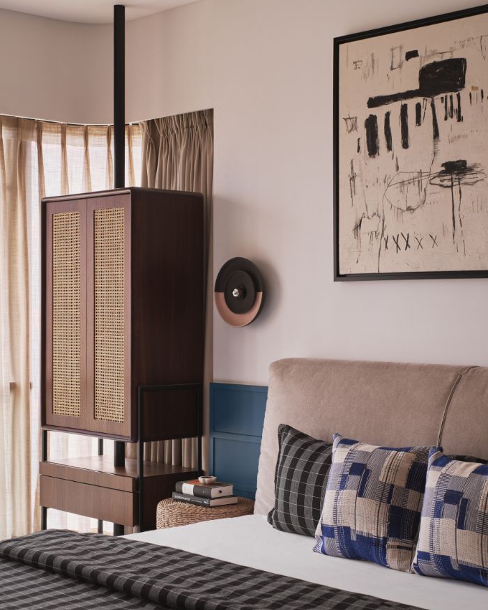 The extensive use of wood provides the warmth and comfort the home seeks, pairing well with the marble flooring that exudes quiet sophistication. Linen, jute and cotton are some of the natural textiles that accompany this mix, chosen considering the way they will age and bring character to the home. A sleek pendant light occupies the limelight of the dining area, a dramatic entity perfectly paired with minimalist modern dining chairs and a simple table. The restful palette continues into the bedroom – muted walls, soft oak elements and cane-fronted wardrobes and an upholstered headboard, that create layers of textures, yet not overwhelming the space. The artisanal powder room of the home stands out with dark-toned surfaces, stone textures and fine brass accents, complete with a minimalist mirror. Despite a simple brief, the home feels familiar and collected, a space that is welcoming and refined.