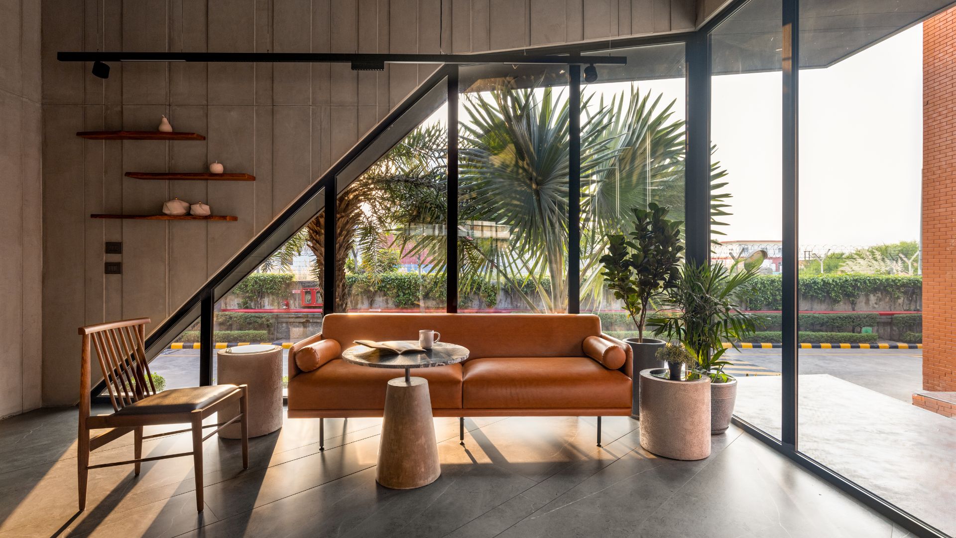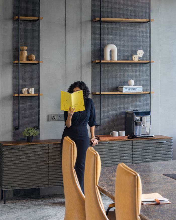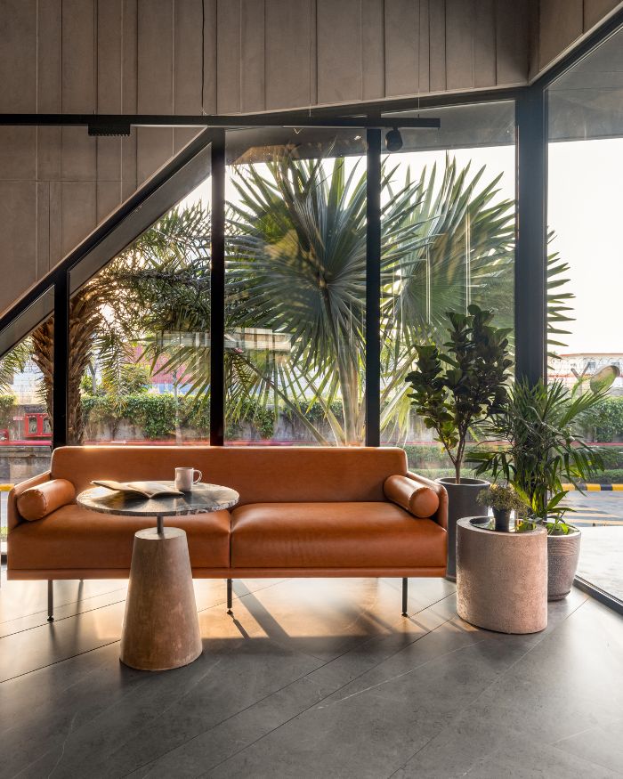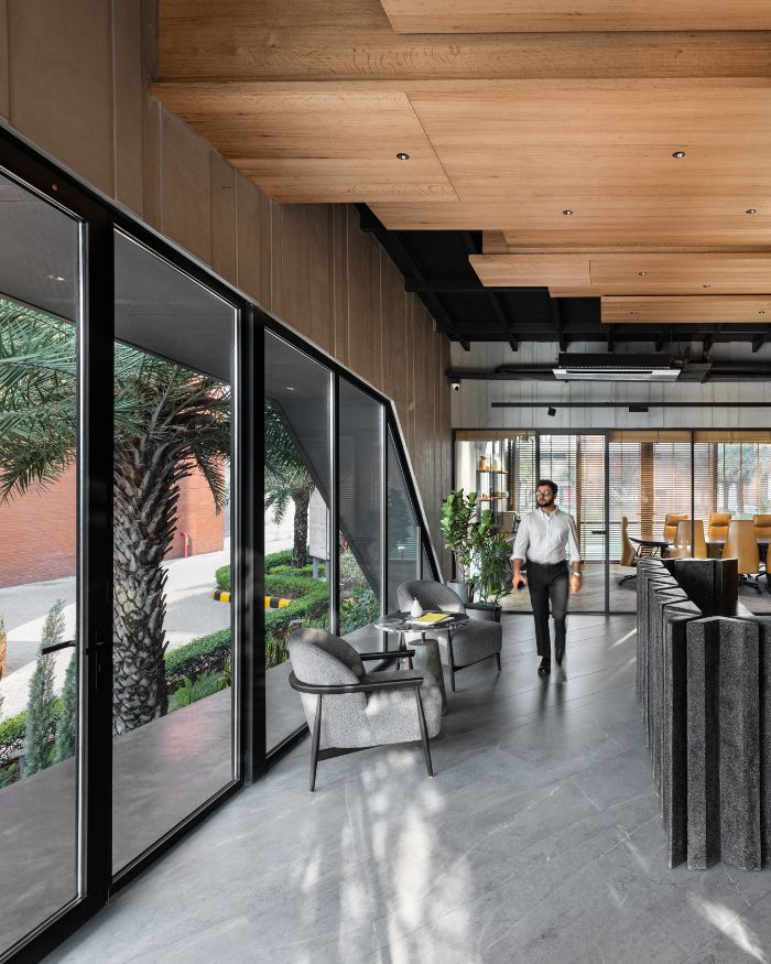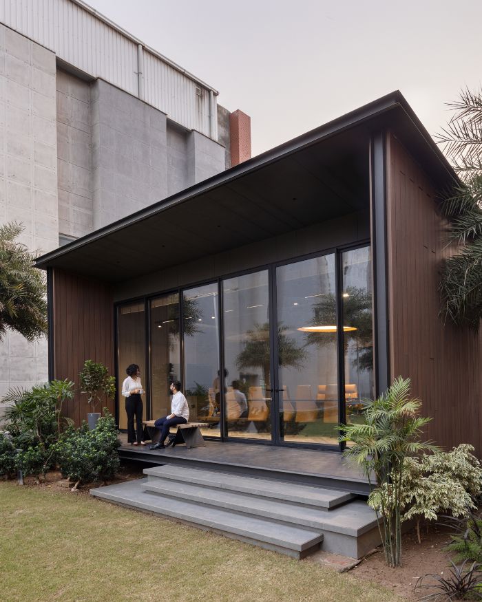 Led by principal architects Karan Arora and Varchasa Duggal, the co-founder duo of the firm, the workspace emerges to be a realistic concept of a refuge within a factory. “The idea was to create a cabin-like retreat, tucked into a green pocket of the factory, something that feels completely detached from the industrial rush outside. A quiet, immersive escape right in the middle of a bustling setup,” explains Karan.