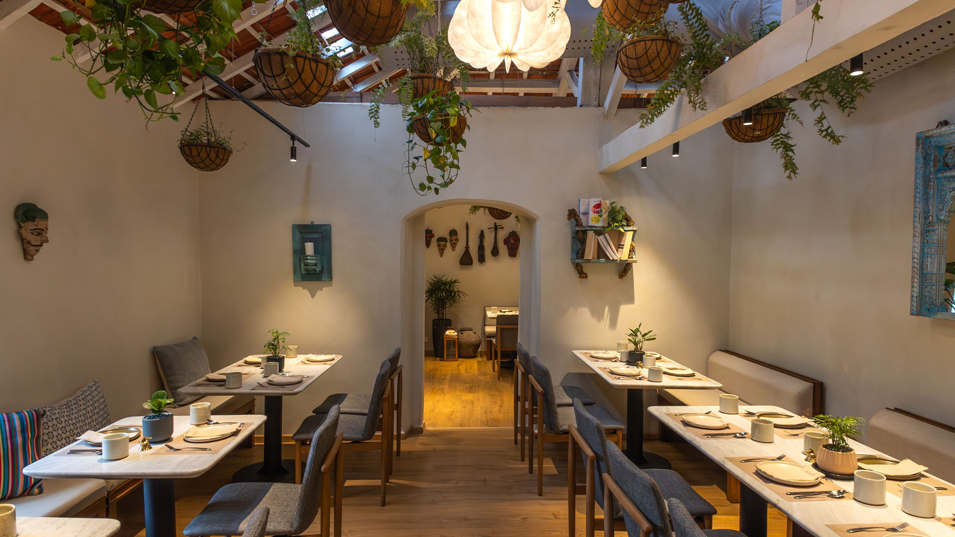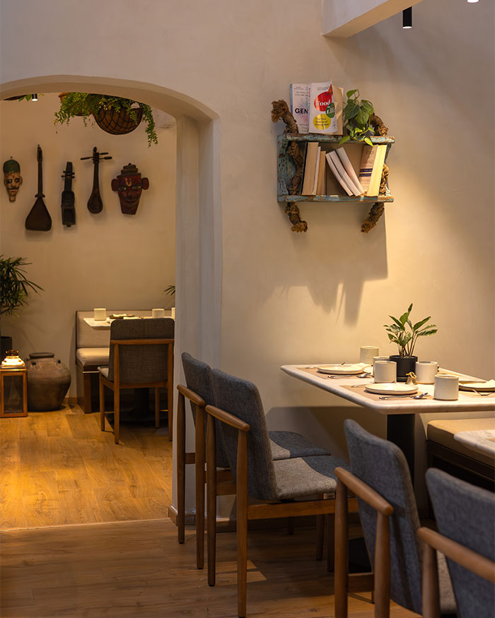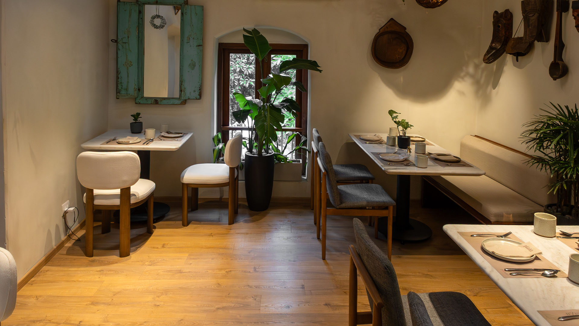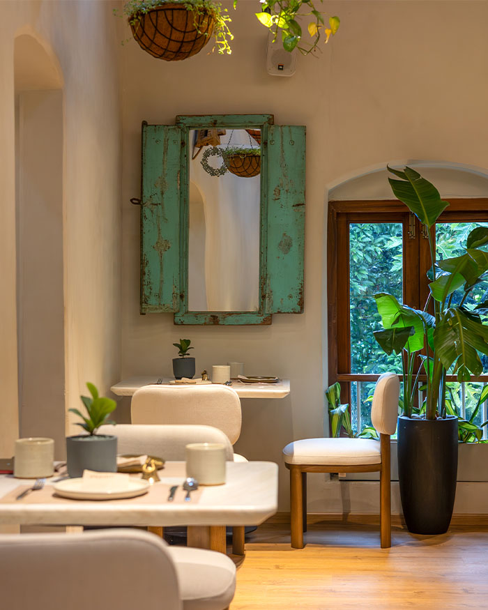 True to Satyajeet and Pashmin’s words, Paashh’s ‘soil to soul’ philosophy is evident across both the exterior and the interiors. The menu, we’re told, is seasonal — aligning with the shifting hues of the greens that bedeck the facade. Driven by Founder Vaishali Karad’s vision, the space doesn’t just preach conscious living: it practices, embodies, and teaches the same.