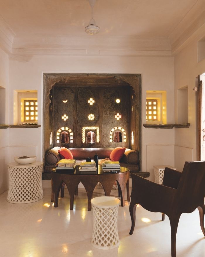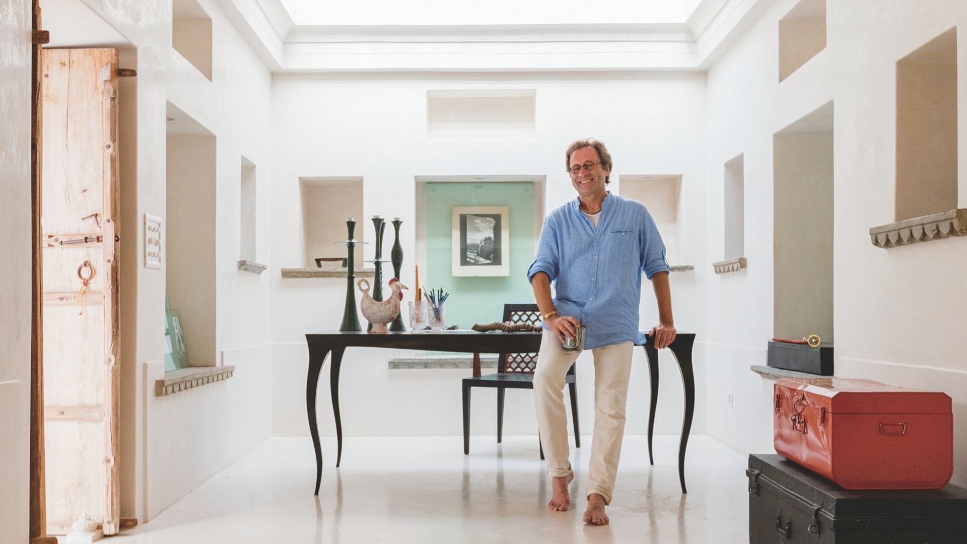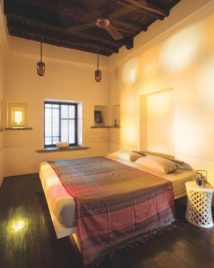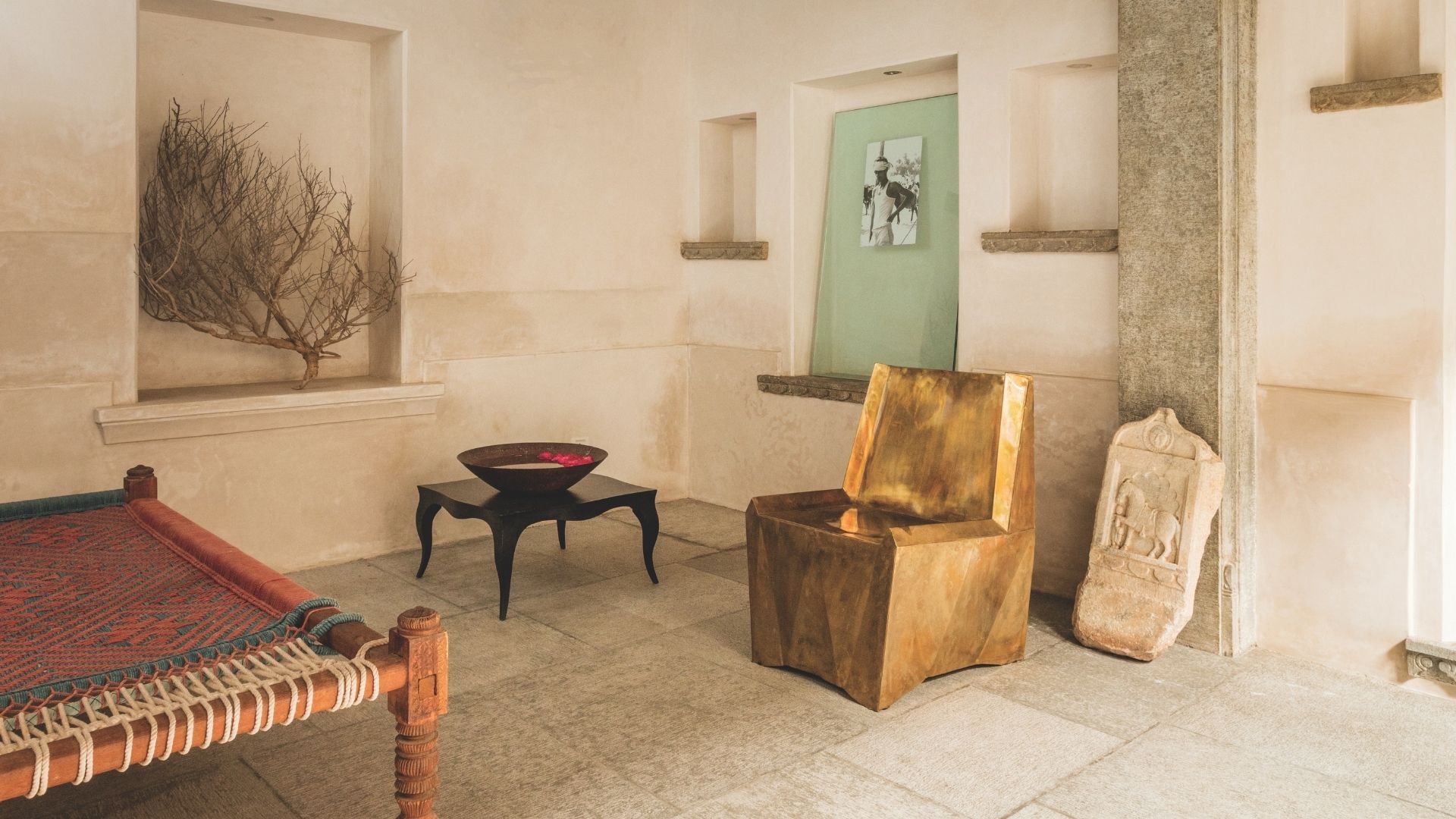 A fitting contrast to the chaos and colours of Udaipur, Paul’s home follows a quiet palette of chalk ivory and calm grey. The spacious, airy rooms have deliberate hints of wood and aged metal, most from the prototype furniture Paul created.  While the base level has two bedrooms and an open courtyard that expands to a bamboo roofed meeting area, the first floor houses the kitchen, Paul’s reading room/boudoir and study with a skylight right above his work desk. On the terrace is a jali work tibari made for the house, where he savours brunches or the one-off Sufi concert with his friends. “I live with an open mind,” he proclaims, when illustrating why none of the areas have one definitive purpose. “In India, a room becomes anything you want it to be – if you feel like eating dessert, a plate is served to you! I love that about this country’s culture