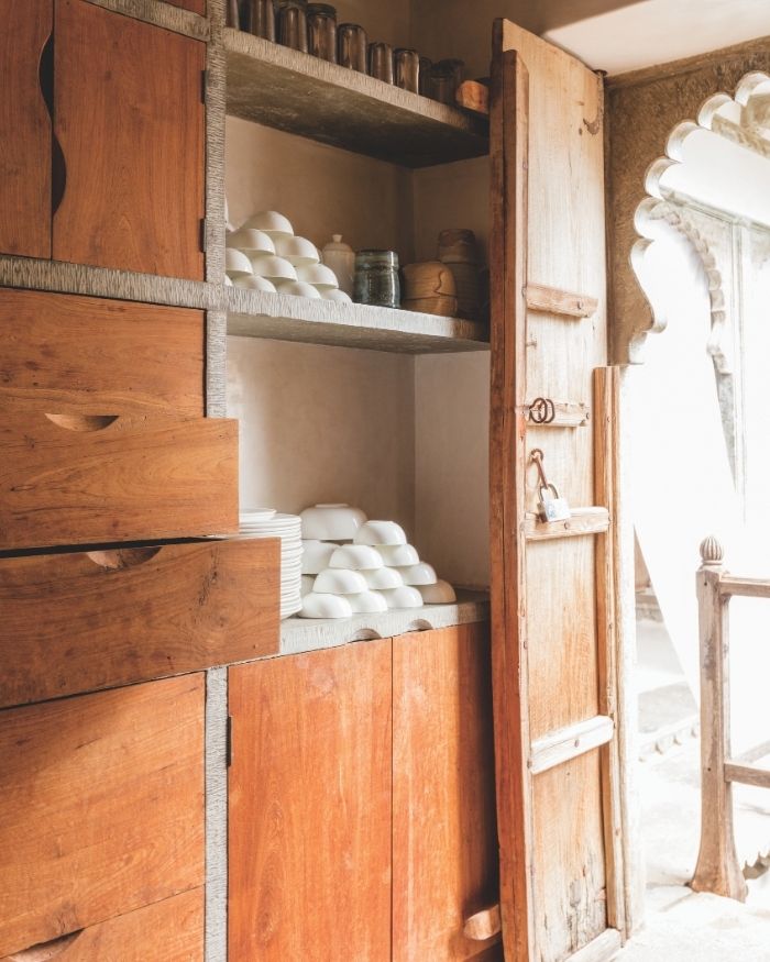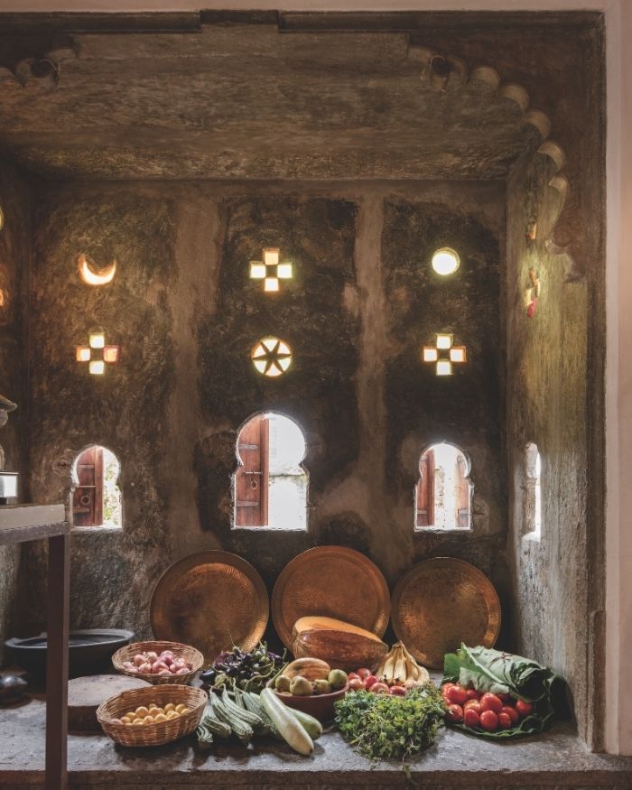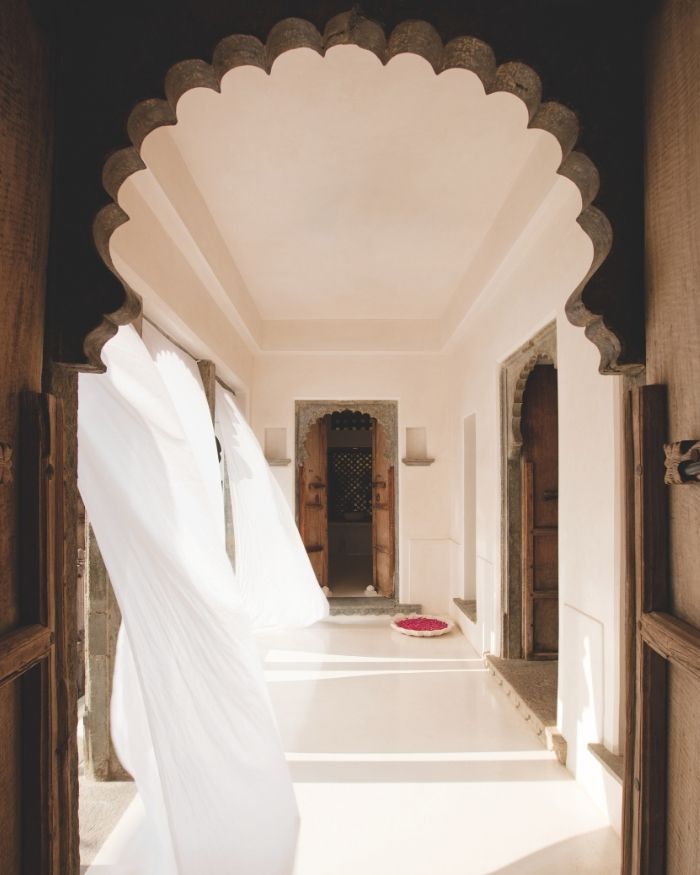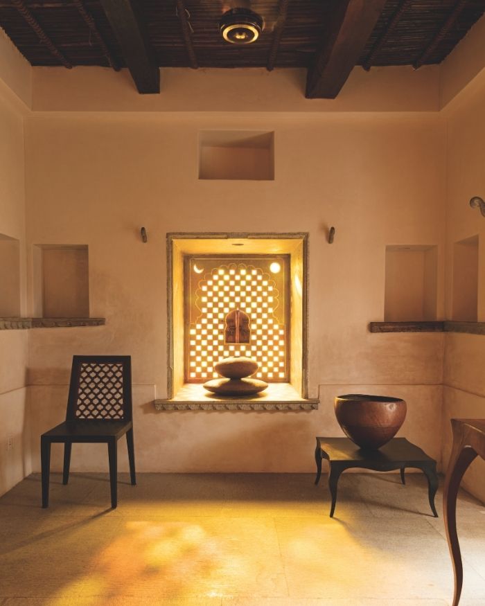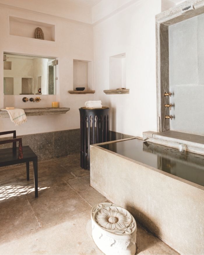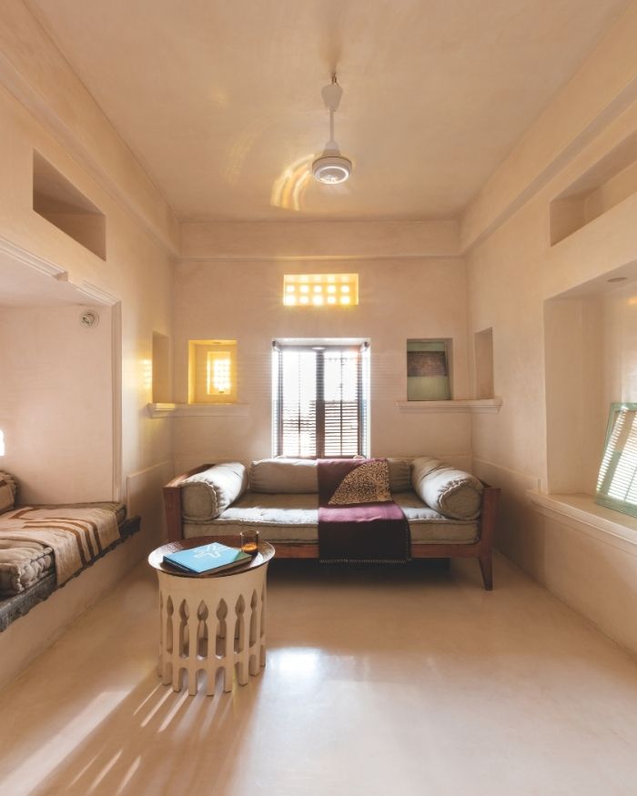 A fitting contrast to the chaos and colours of Udaipur, Paul’s home follows a quiet palette of chalk ivory and calm grey. The spacious, airy rooms have deliberate hints of wood and aged metal, most from the prototype furniture Paul created.  While the base level has two bedrooms and an open courtyard that expands to a bamboo roofed meeting area, the first floor houses the kitchen, Paul’s reading room/boudoir and study with a skylight right above his work desk. On the terrace is a jali work tibari made for the house, where he savours brunches or the one-off Sufi concert with his friends. “I live with an open mind,” he proclaims, when illustrating why none of the areas have one definitive purpose. “In India, a room becomes anything you want it to be – if you feel like eating dessert, a plate is served to you! I love that about this country’s culture