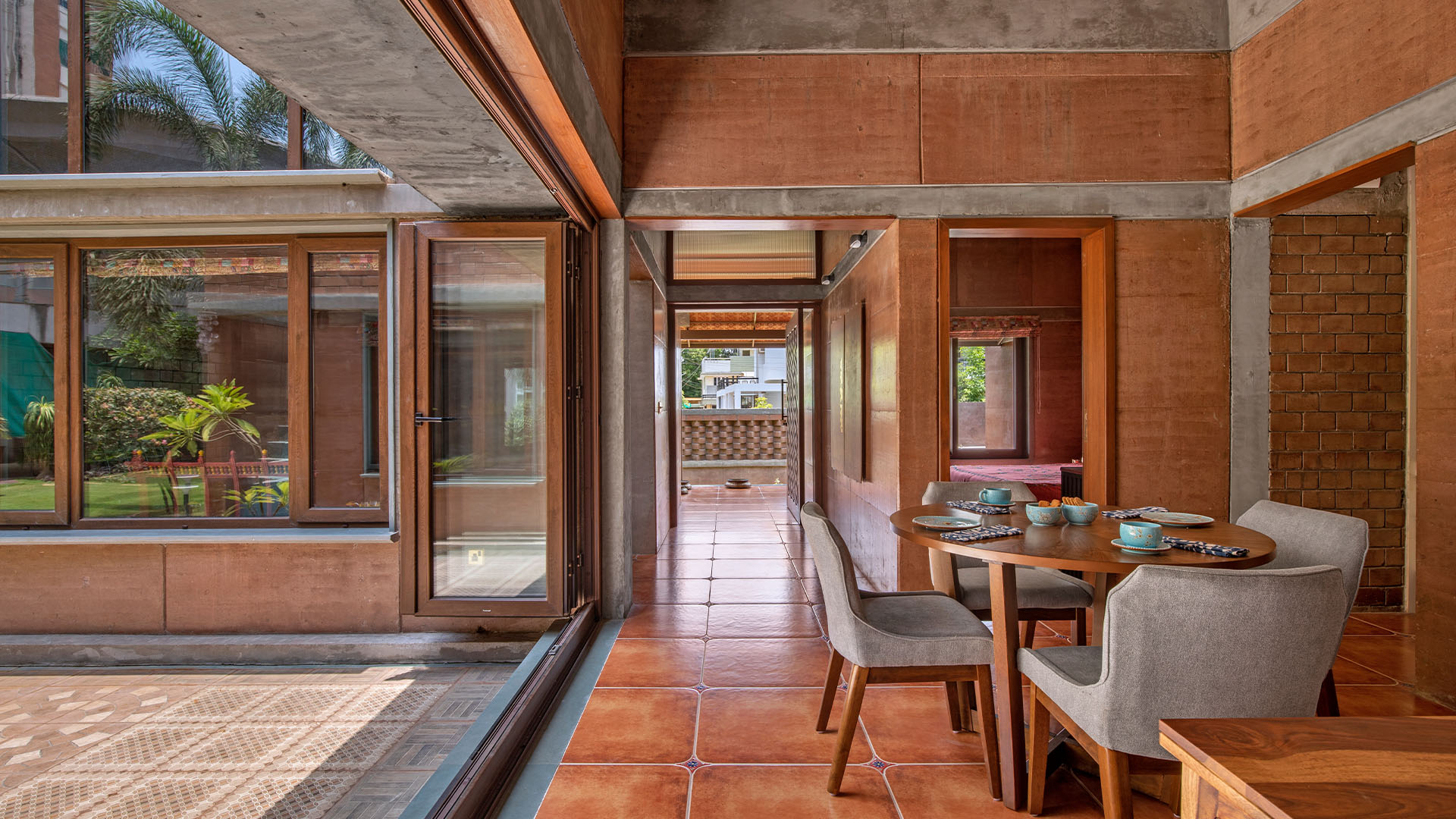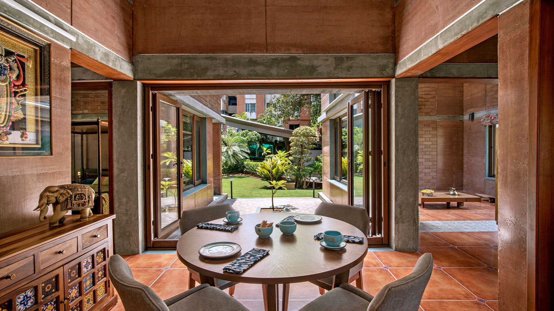 “This home is a dialogue between convenience and conscience, modernity and heritage,” says Pranav, who leads his eponymous studio, “We take immense pride in having shaped this architectural expression that celebrates sustainable living and local craftsmanship.” For a species which has for centuries been surrounded by shades of brown and terracotta, this kind of life is not new. Neither is the idea of local craftsmanship.