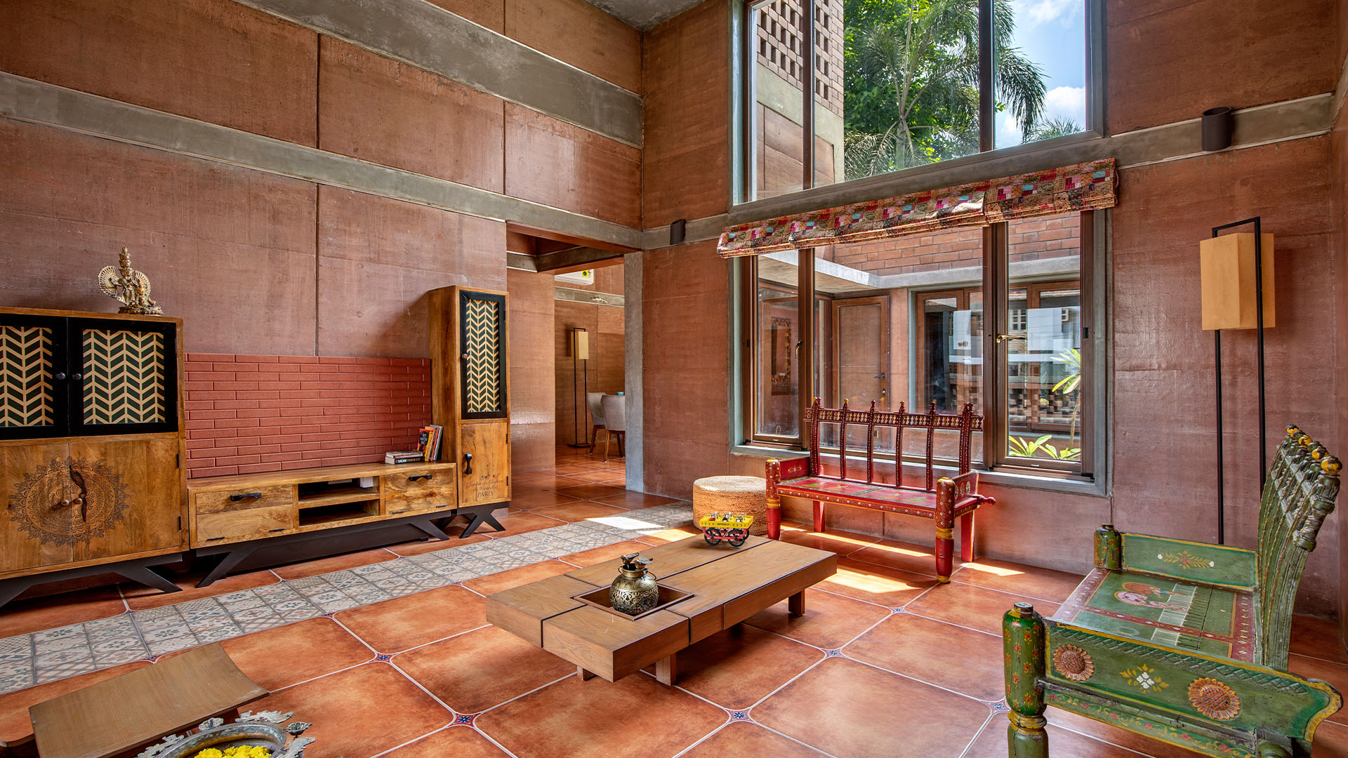 How often do we stop to consider the way we are supposed to live? What is the ideal human habitat for a tropical landscape? Is it one with enormous volumes with insurmountable ostentatiousness? Indomitable white walls closing in on you like a sensory deprivation tank? Or is the mental image closer to this 2,900 sq ft house in brick and mortar by Pranav Patel Design Studio in collaboration with Hunnarshala?