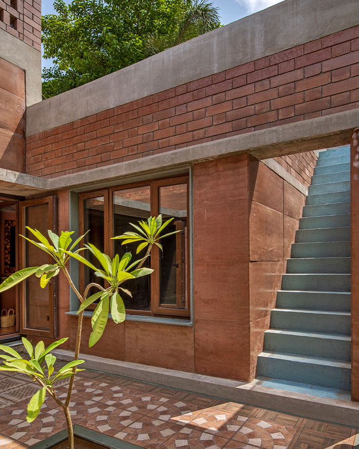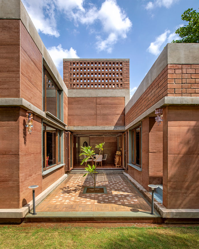 How often do we stop to consider the way we are supposed to live? What is the ideal human habitat? Is it one with enormous volumes with insurmountable ostentatiousness? Indomitable white walls closing in on you like a sensory deprivation tank? Or is the mental image closer to this 2,900 sq ft house in brick and mortar by Pranav Patel Design Studio in collaboration with Hunnarshala?