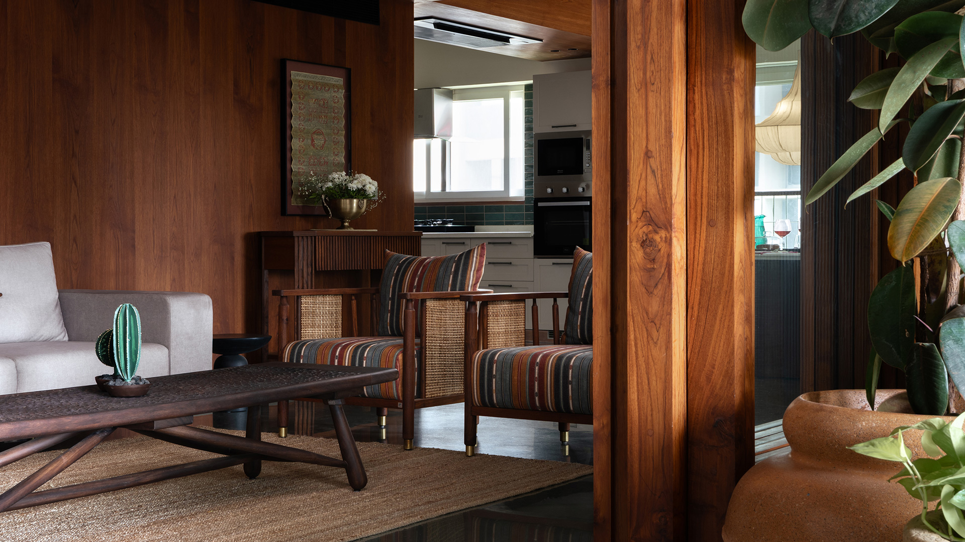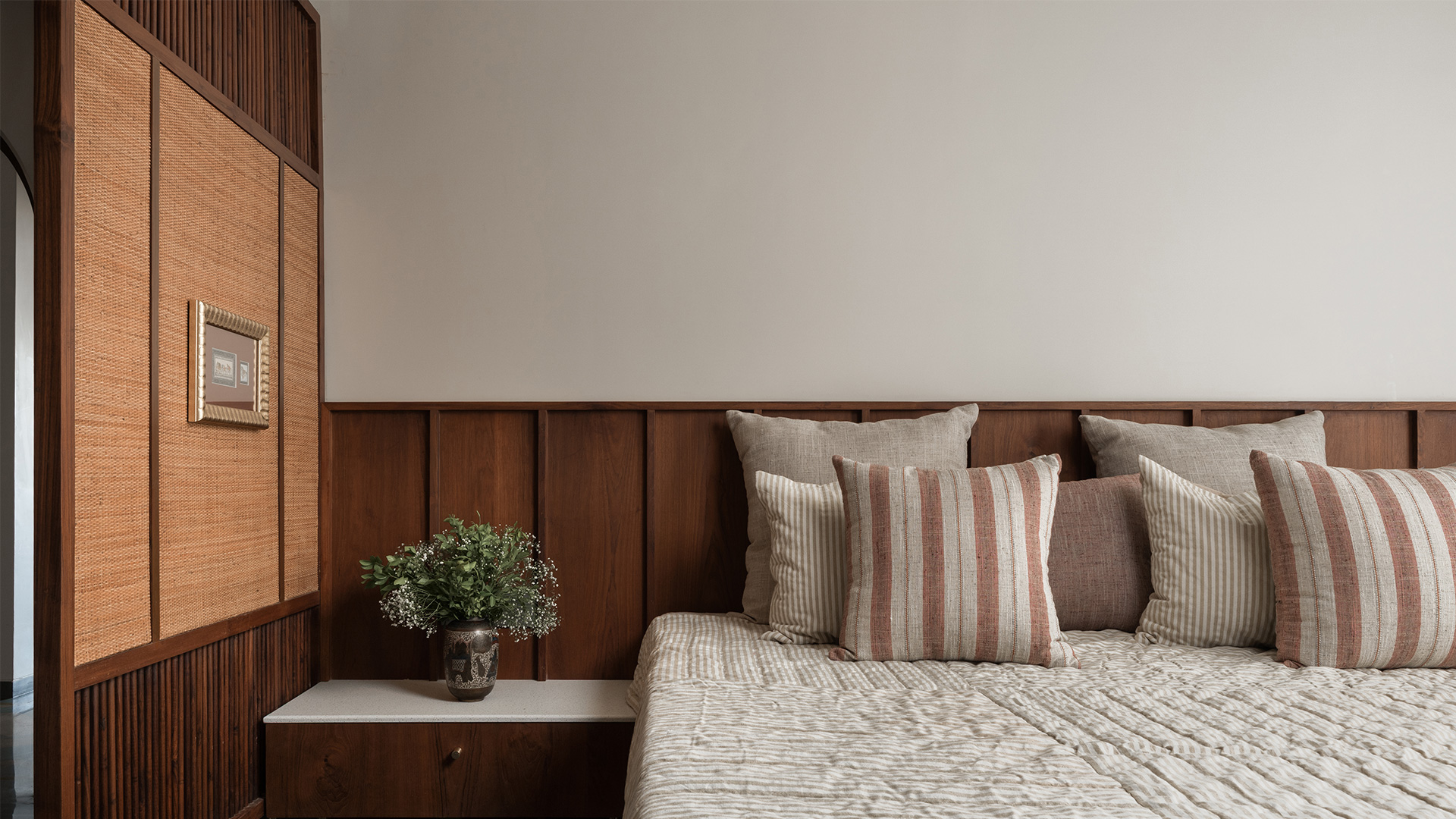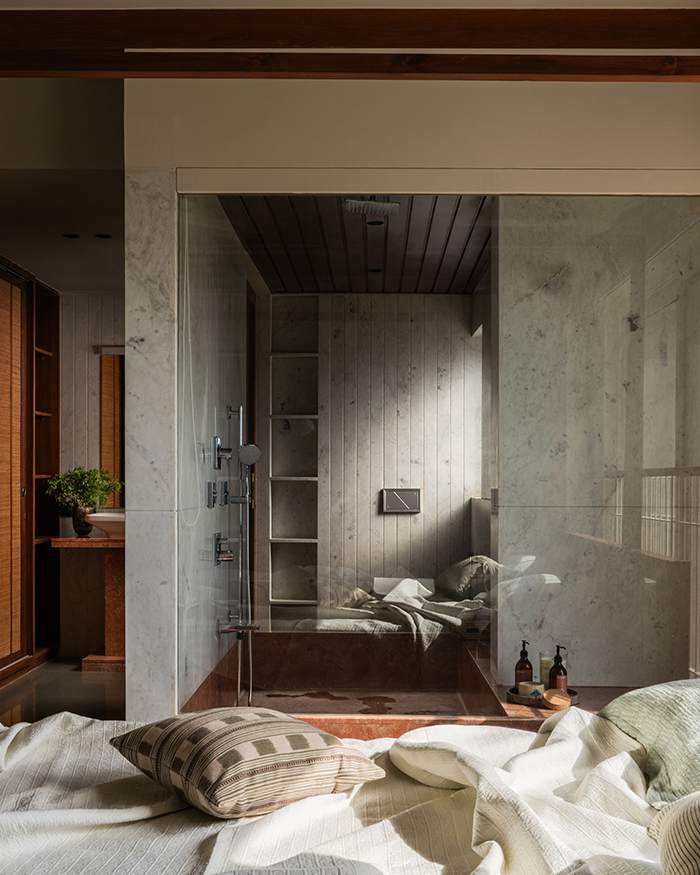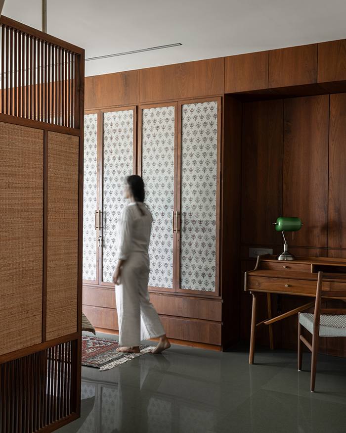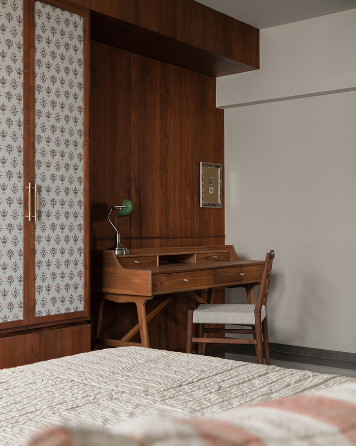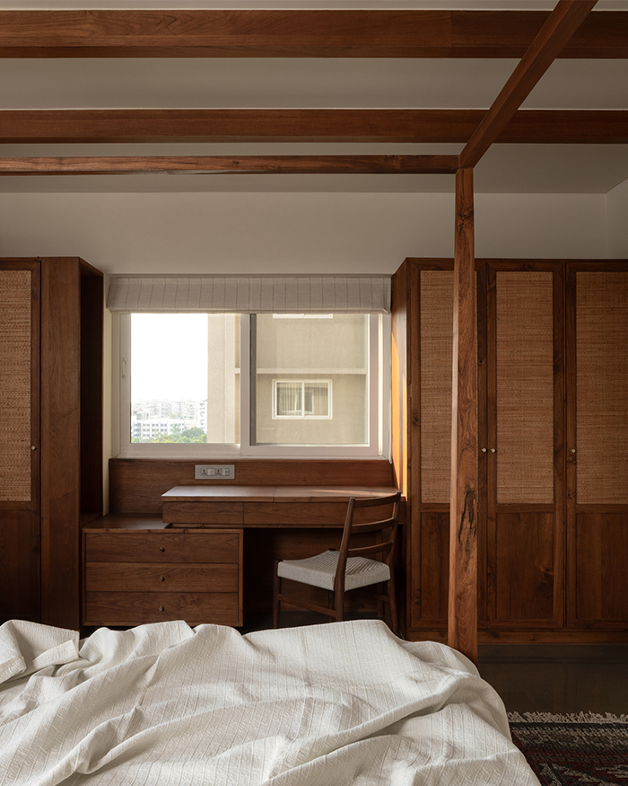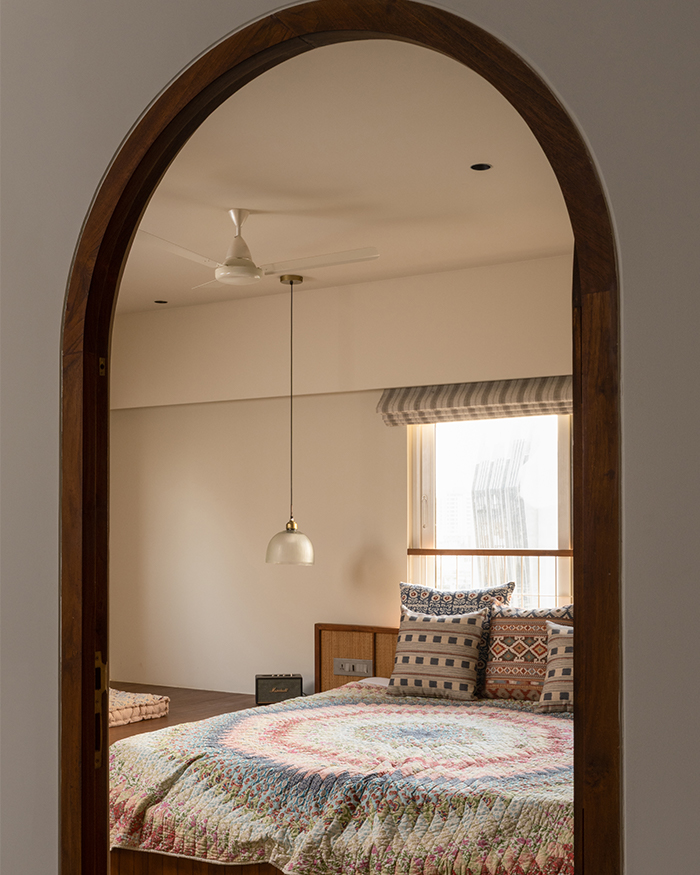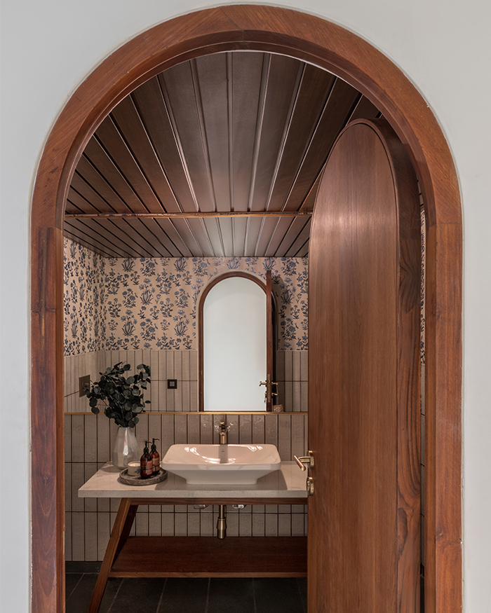 What ensues is an orchestration of rooms that flow into one another with ease, yet are made cosy with wall-to-wall wooden finishes, doorways with demure arches, and select artworks that welcome conversation. Made to play host while also acting as a serene sanctuary, this home is one juxtaposition within another while managing to tick all the boxes.