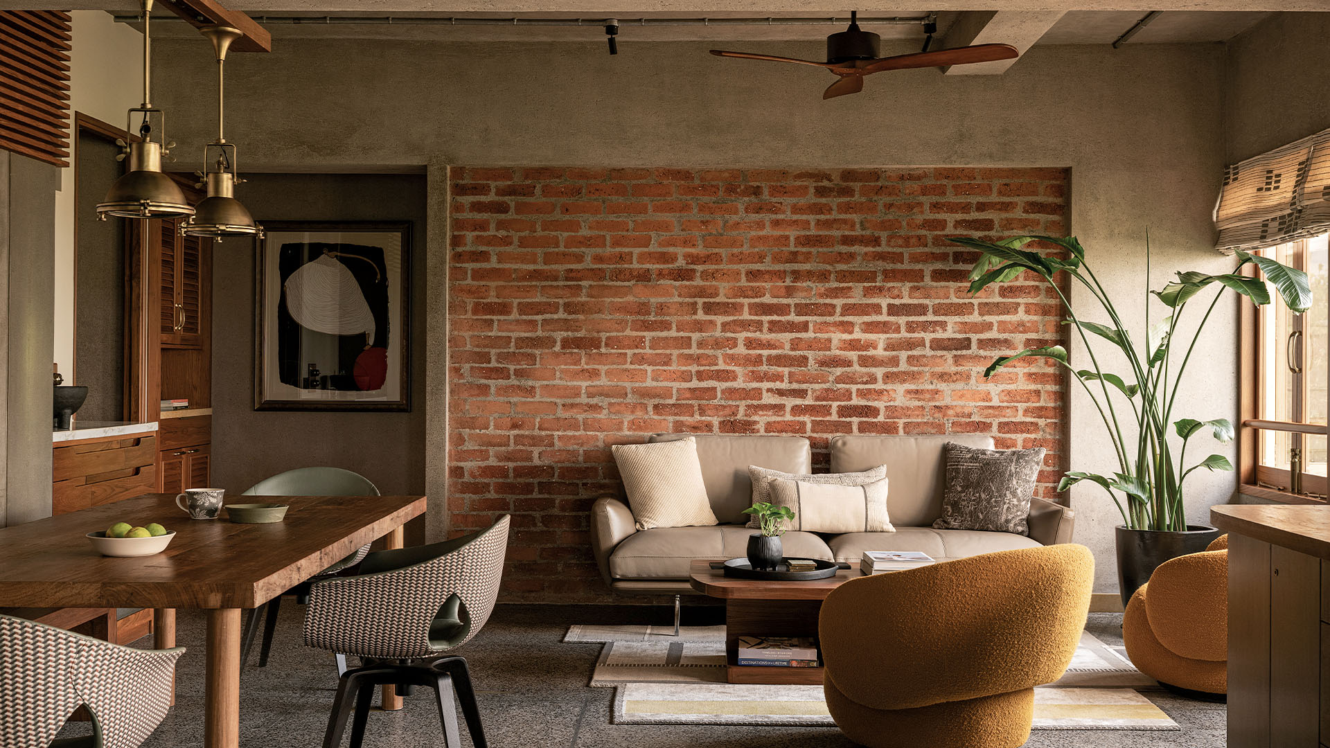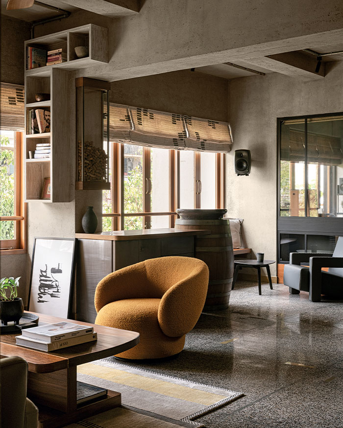 Architect Puran Kumar’s Mumbai home is fitted with all the aspirational luxuries of modern living, but nothing lights his face up as much as the bat that lives in the tree outside his bedroom window. The EDIDA winner is clearly very fond of the Prabhakar Kolte artwork that he’s placed at the entrance, and also appears graciously pleased with the way an assortment of Italian branded furniture, sourced at the behest of his team at Studio PKA, has come together in the living room. It is obvious he’s put a lot of thought into his design for his bespoke bar unit, which is a beer barrel, and when he puts on an audiovisual installation by Sameer Kulavoor, it is evident that familiarity has not dulled his admiration for the work. And yet, when he catches a glimpse of the bat perched outside his bedroom window, he can’t help but take a moment to quietly enjoy it. “This house is a window to nature,” he tells me. “Everybody vies for our attention: there are silverbills and parakeets, kingfishers, cuckoos, sparrows, squirrels on the trees. In a city like Mumbai, it is something to be relished.” To that effect, the design of the apartment, with its clean concrete-finish walls, undulating terrazzo floors and swathes of rich teakwood, is a ritual of that relishment. 9PM — the name is a play on the address, and also an allusion to the family’s penchant for hosting — has been home to the Kumars for many years, and recently expanded to include the neighbouring unit as well. The added space allowed for an easier, more open plan; one in which, no matter your vantage point, you are always looking out onto something green. First, there’s the combined living and dining, the heart of the home, that overlooks the green canopies of Worli’s bylanes and the Arabian Sea beyond. “This view is going to go,” he shrugs, “A new construction is coming up there, but we are enjoying this even for a year or so, so we can’t complain.”
