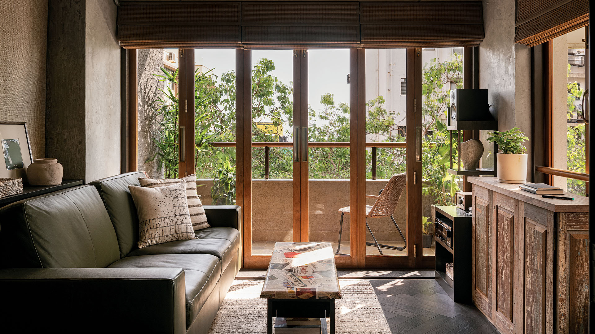 Architect Puran Kumar’s Mumbai home is fitted with all the aspirational luxuries of modern living, but nothing lights his face up as much as the bat that lives in the tree outside his bedroom window. The EDIDA winner is clearly very fond of the Prabhakar Kolte artwork that he’s placed at the entrance, and also appears graciously pleased with the way an assortment of Italian branded furniture, sourced at the behest of his team at Studio PKA, has come together in the living room. It is obvious he’s put a lot of thought into his design for his bespoke bar unit, which is a beer barrel, and when he puts on an audiovisual installation by Sameer Kulavoor, it is evident that familiarity has not dulled his admiration for the work. And yet, when he catches a glimpse of the bat perched outside his bedroom window, he can’t help but take a moment to quietly enjoy it. “This house is a window to nature,” he tells me. “Everybody vies for our attention: there are silverbills and parakeets, kingfishers, cuckoos, sparrows, squirrels on the trees. In a city like Mumbai, it is something to be relished.” To that effect, the design of the apartment, with its clean concrete-finish walls, undulating terrazzo floors and swathes of rich teakwood, is a ritual of that relishment. 9PM — the name is a play on the address, and also an allusion to the family’s penchant for hosting — has been home to the Kumars for many years, and recently expanded to include the neighbouring unit as well. The added space allowed for an easier, more open plan; one in which, no matter your vantage point, you are always looking out onto something green. First, there’s the combined living and dining, the heart of the home, that overlooks the green canopies of Worli’s bylanes and the Arabian Sea beyond. “This view is going to go,” he shrugs, “A new construction is coming up there, but we are enjoying this even for a year or so, so we can’t complain.”