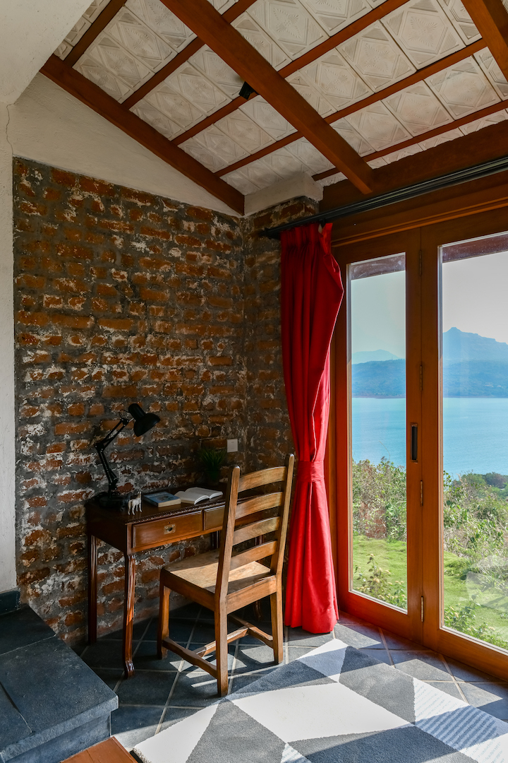 We absolutely love the sitting room in the main block. Here, brick walls jut out from the sides to frame the view of not just the minimally styled sitting area but also of the pool, the lake and Tungi Fort in the distance. “This area has been created such that the Fort is centred against the 30ft wide room, and that the view is layered with that of the indoor space, the outdoor deck, the pool, the dam and lake, and the hill in the distance. The abode exists in tandem with the elements around it—a subliminal nod to nature itself,” concludes Kumar.