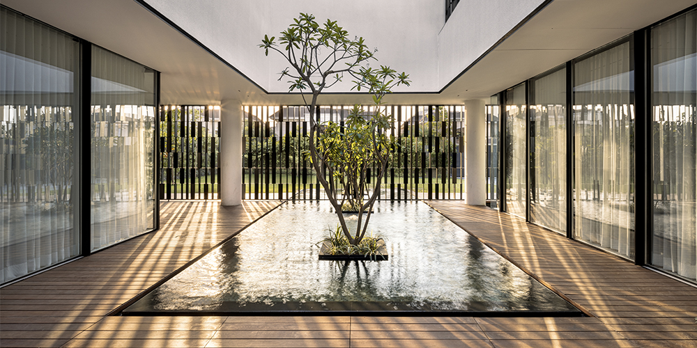 “Driven by all the trappings of minimalism, the building reiterates its connection to nature in whichever direction one chooses to look. Lush greens, filtering sunlight, and reflective indoor water body synchronously envelope and penetrate the built mass, thereby establishing the narrative of a suspended structure emerging from the exuberant foliage.” says Samridh Aneja