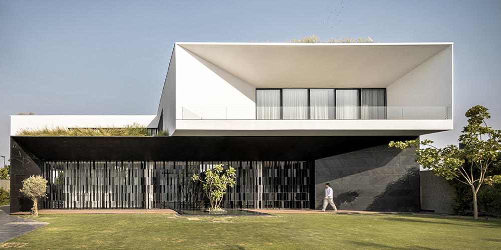 Segregated into three monolithic blocks connected by continuous spaces, the in-between voids transform into courtyards and open spaces. A meandering driveway with a cluster of trees establishes a connection with nature at the entrance. The waterbody forms a perfect gap between the building and its surroundings. The highly ventilated area connects the house to natural open spaces.