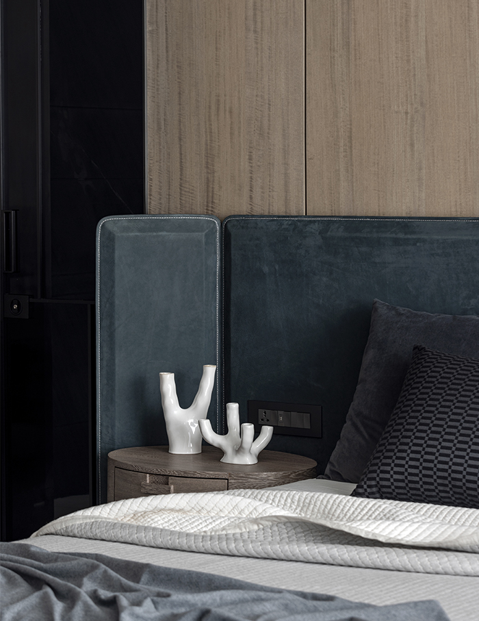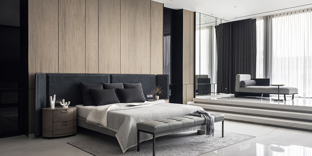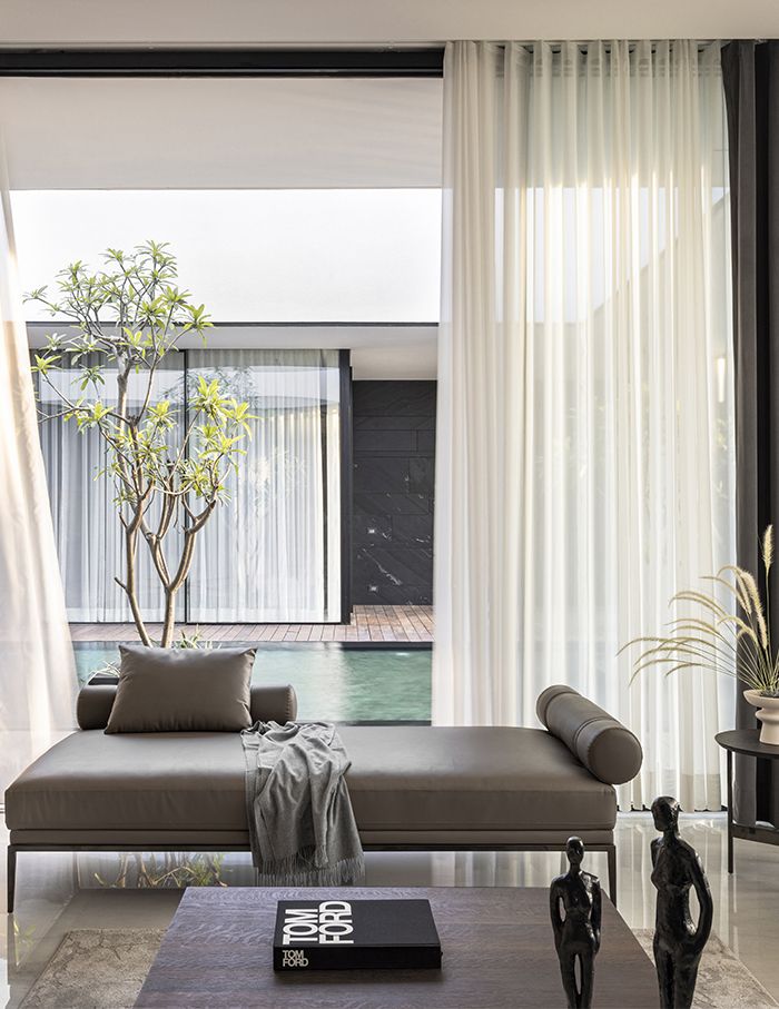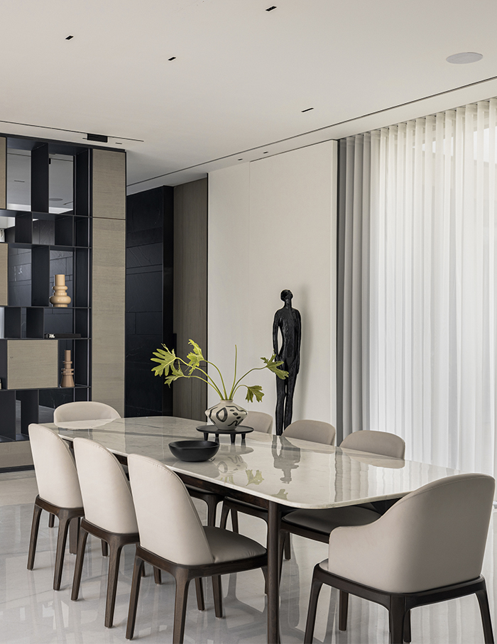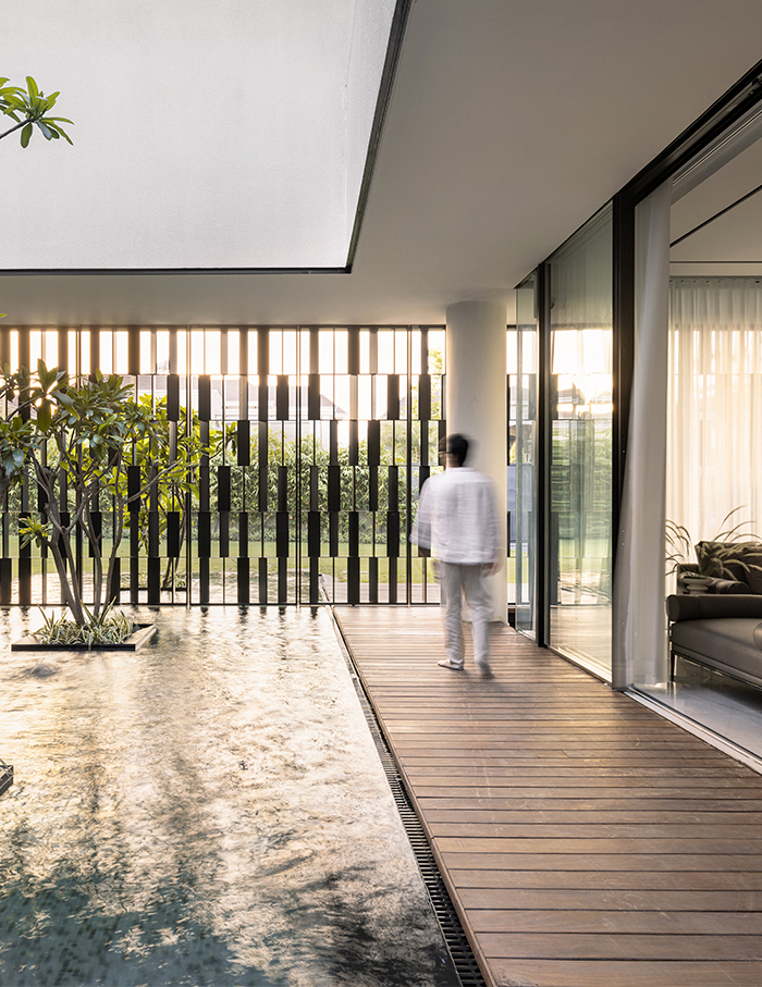 Located on the first floor, the master lounge divides yet merges the formal and informal areas. The master and son’s bedrooms placed alongside on the same floor overlook the waterbody and outdoor decks. The office, library, audio/visual room and gym also take the first floor. All rooms follow a monochromatic theme with rich minimal design, and yet have their own individual voices.