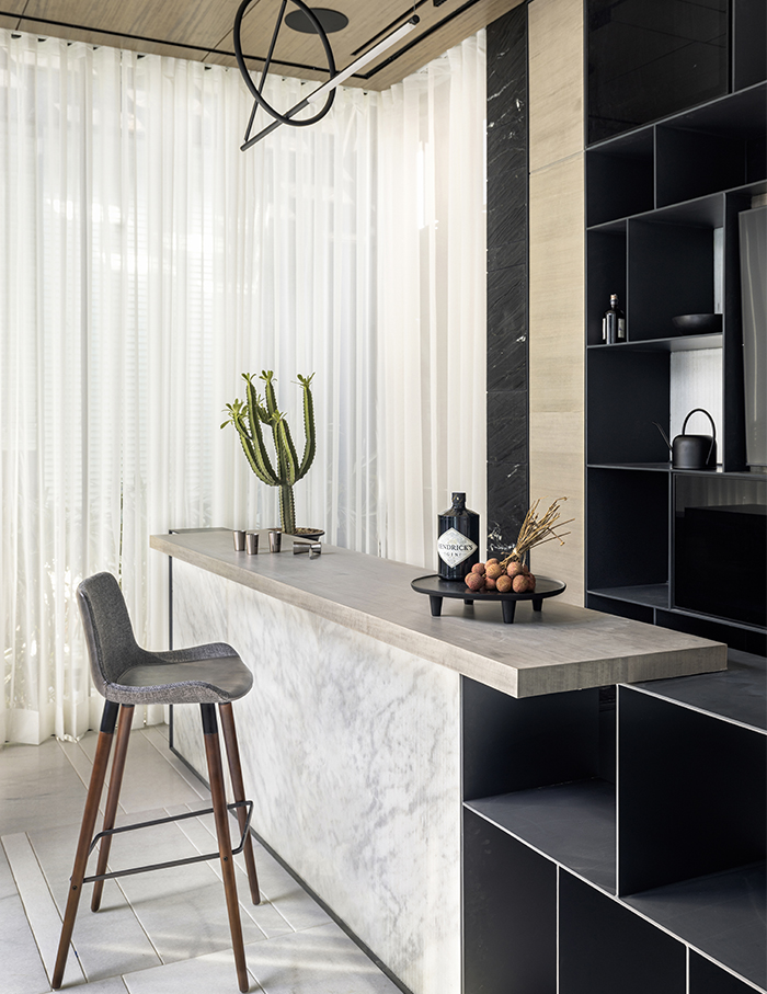 The outdoor bar is curtailed by glass with a wooden pattern on the ceiling mirroring the stone grooved flooring. A glimpse of the brutal external material palette can be reflected on the edges of the feature wall.