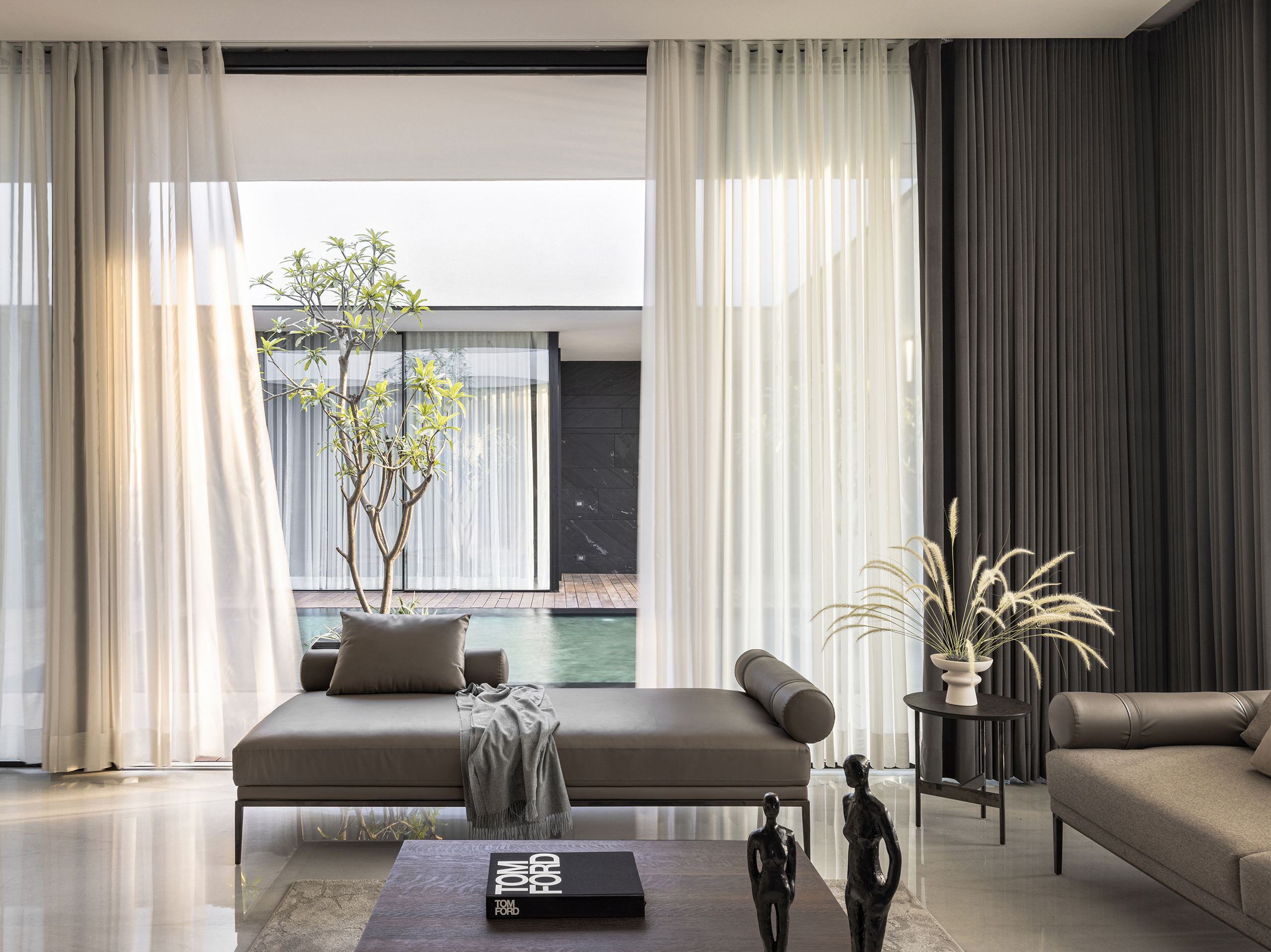 White Bianco Lasa flooring reflects the daylight entering the home through the liquid glass screens and layers of white fabric drapes along with subtle interactions between veneers and aluminium wall finishes.