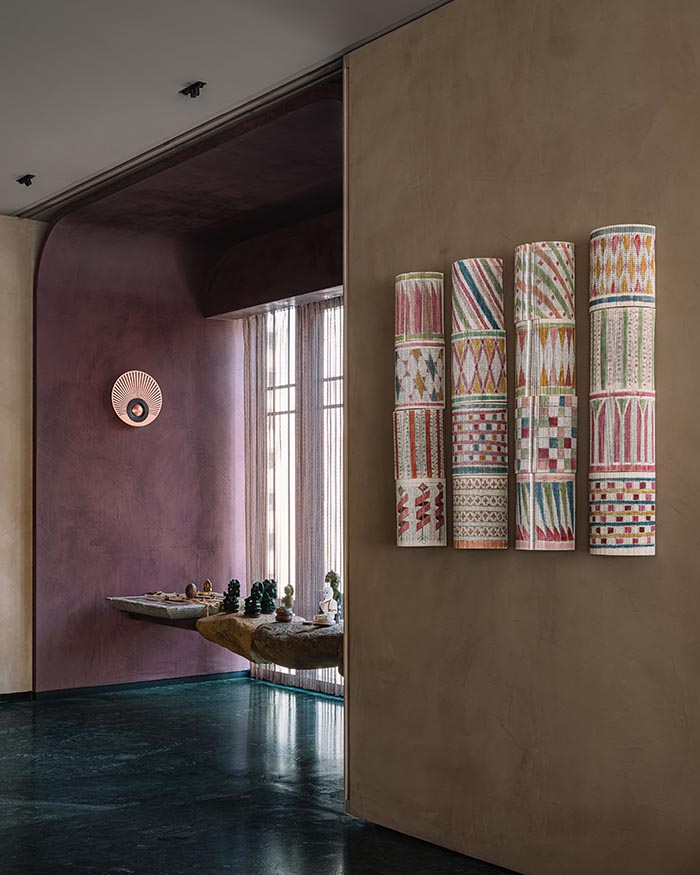“We called it so because the home unfolds like a cabinet of curiosities, a layered collection of moments, materials and ideas that reveal themselves over time,” say the Principal Designers of the studio, Rajiv Parekh, Ekta Parekh and Maithili Raut. In a repudiation of convention, they opted instead to choreograph movement in a way that heightens one’s experience. The two living areas, for instance, share the same earthy semantics, but their expressions differ entirely. Where the formal space is composed and restrained, owing to more stoic choices in seating, the informal space, only a few feet away, sports a bold 14 ft swing sofa designed by reD Architects, surrounded by a burst of colour.