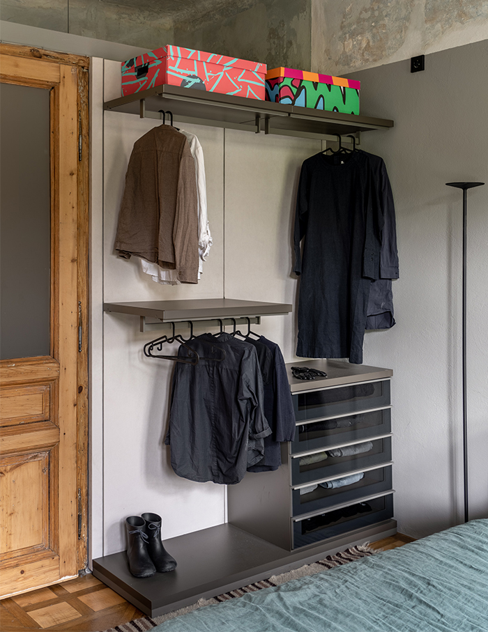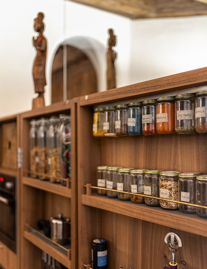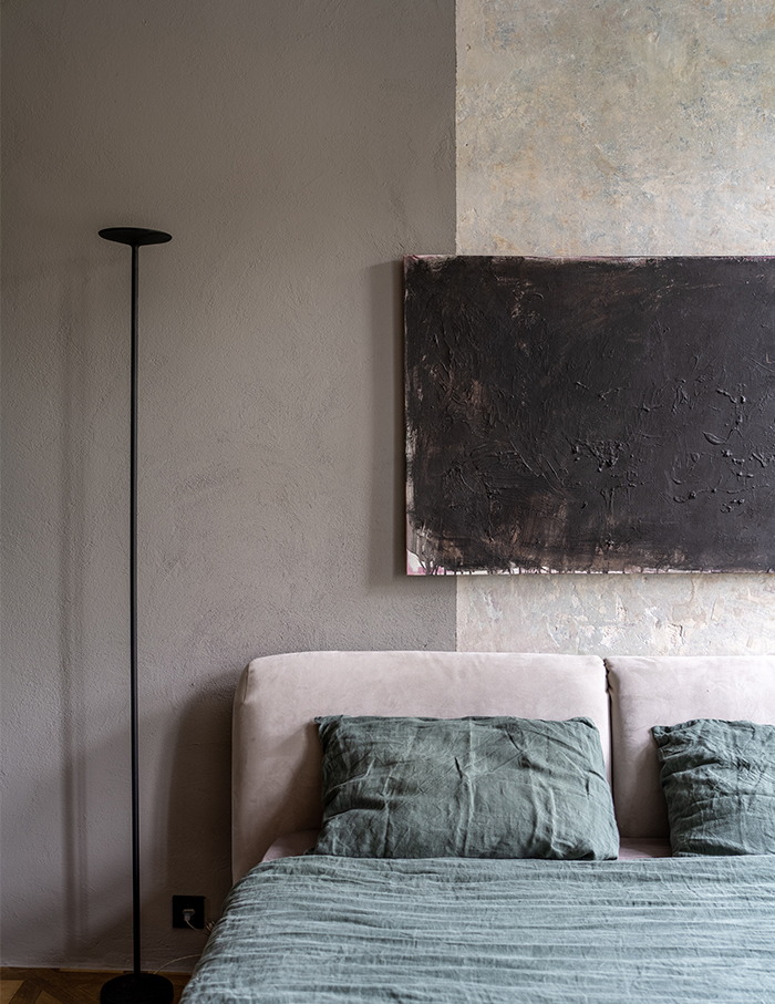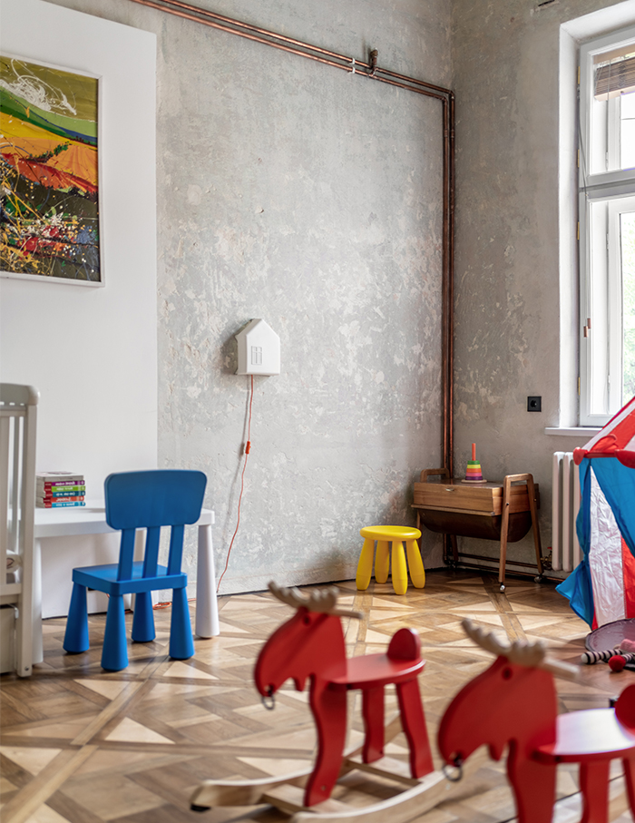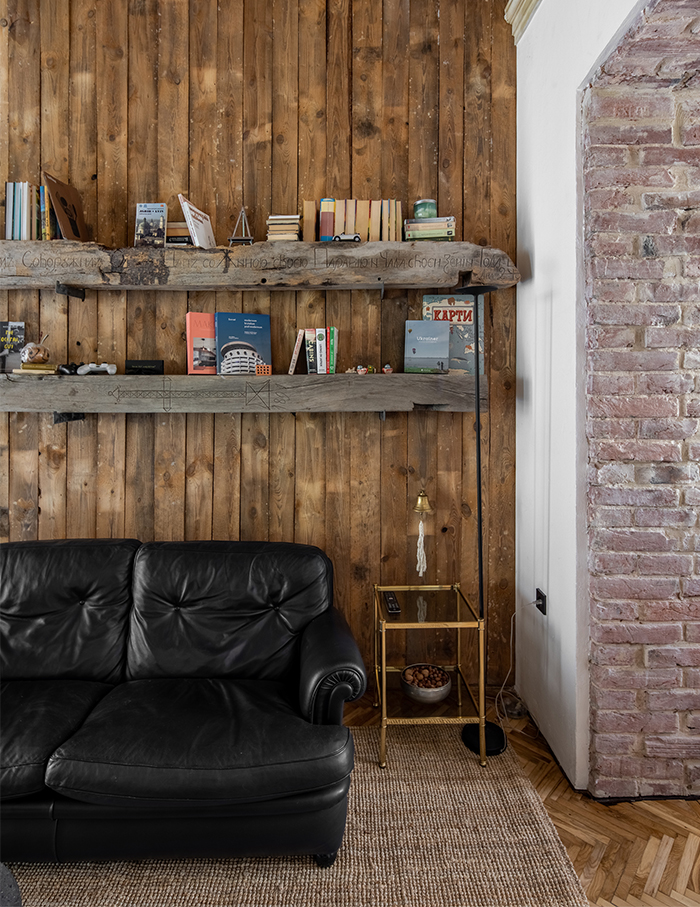 The creatives renovated the parquetry flooring throughout the apartment, except for the kitchen. This area is clad in natural marble tiles over the integrated heating. In the bedrooms too, small frescos that survived the test of time are illuminated by carefully installed wall sconces. Apart from these, other vintage keeps include a mid-19th century antique wardrobe and a historical stove from Levynskyi factory that was reincarnated into a big, open fireplace.