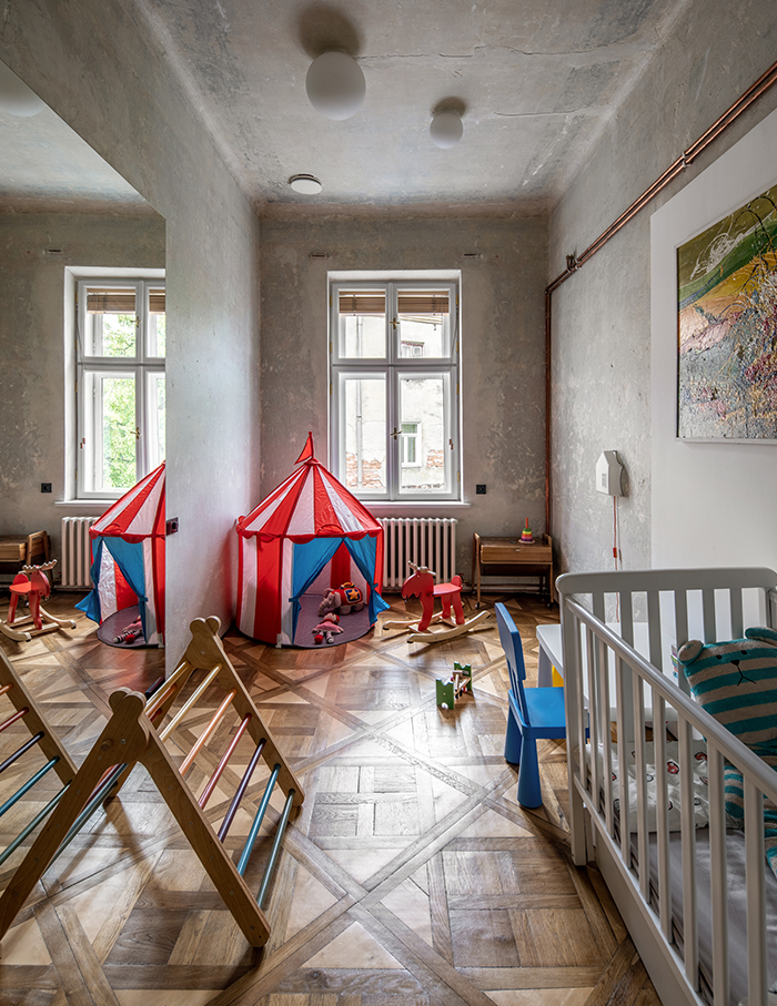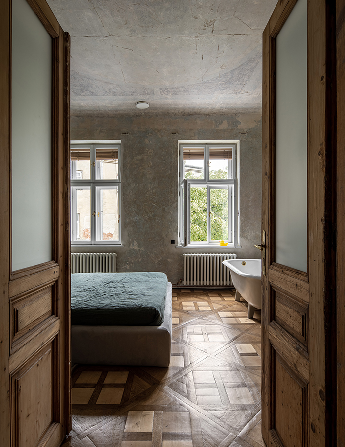 Refurbishing this residence allowed the creatives to revisit past architectural styles that celebrated a typically warm Ukrainian society, when neighbours communicated from their balconies. To facilitate this, former windows facing the courtyard were replaced by larger ones with aluminium frames, while those on the main facade were replicated in a traditional manner using wood and original fittings.