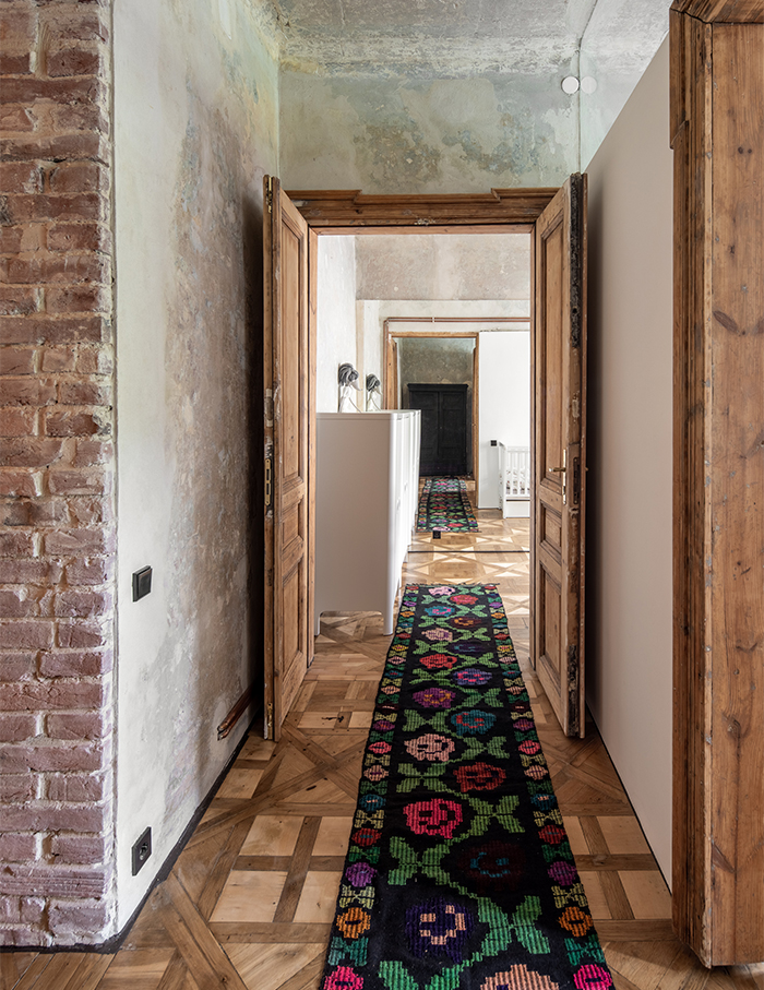 Authentic 19th century doors, which have been scraped and varnished, lead the way into each of the white-walled rooms within the abode christened Guculska. Cracked ceilings in the kitchen and living area were removed, while old wooden beams including some with engraved inscriptions from 1871 by Badzyan’s grandfather were repurposed as part of the decor.