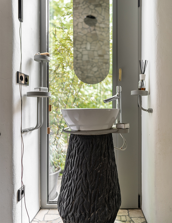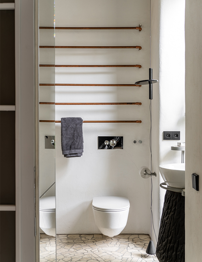 Beyond the living area, on the left two bedrooms reconfigured to isolate the children’s room from the master suite. It is here that the engraved wooden beams from Badzyan’s grandfather’s former home are installed, acting as a deeply cherished memoir as well as a link between different generations in the family.