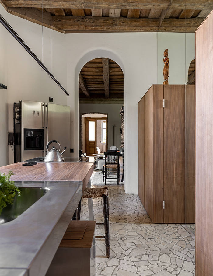 The entrance to the home is positioned between a balcony and living room, both bathed in abundant daylight. The latter also houses a dining area and a television lounge on either side of the ancient, majestic fireplace. An expansive kitchen is designed with a multifunctional counter and an inbuilt sink as well as open walnut cabinets—an exemplary display of functionality and organisation.