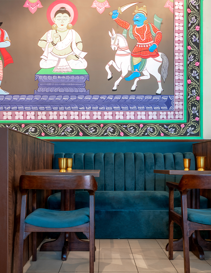 The restaurant gets its moniker from the restaurant founder’s belief in Lord Vishnu and his incarnation Padmanabha. And he is pictorially portrayed eminently throughout the eatery—as part of the artwork that spans the length of the central seating area to the floral motifs that complement its finishing.