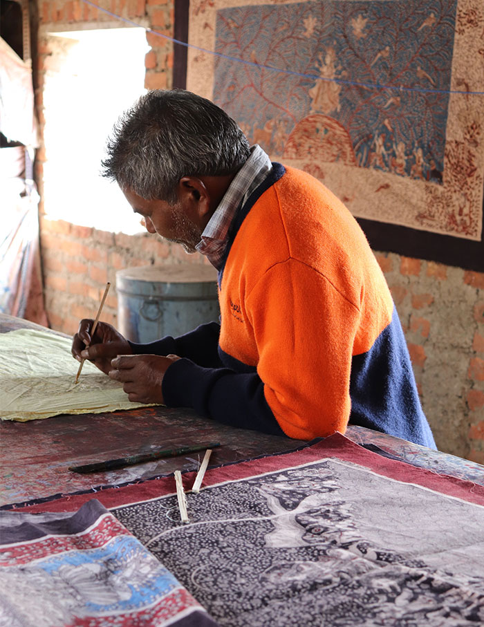 Just 10 minutes from the heart of Ahmedabad, Kiritbhai resides in a humble village that’s preserving the 800 year old Mata ni Pachedi, the craft popularly known as Kalamkari. The artform first emerged when the Vaghri hunter community—excluded from the social system and prevented from entering temples—began painting the goddesses on a sacred cloth and hung it behind temples to worship. Through these hand painted drawings, the commune explored narratives from Hindu mythology and Indian folklore.