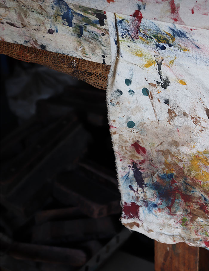 The family’s alfresco workshop features symbols of faith on pink choona walls. Layers of white fabric are laid on a bed to be painted on. Natural dyes of mustards and reds against brick walls lend this space warmth. The artworks that lay around are mesmerising and one particular piece stands out—a wedding scene of dieties Shiva and Parvati, which uses indigo in an ocean of reds and blacks. Kiritbhai explains that the vibrant red and black are quintessential to Mata ni Pachedi.