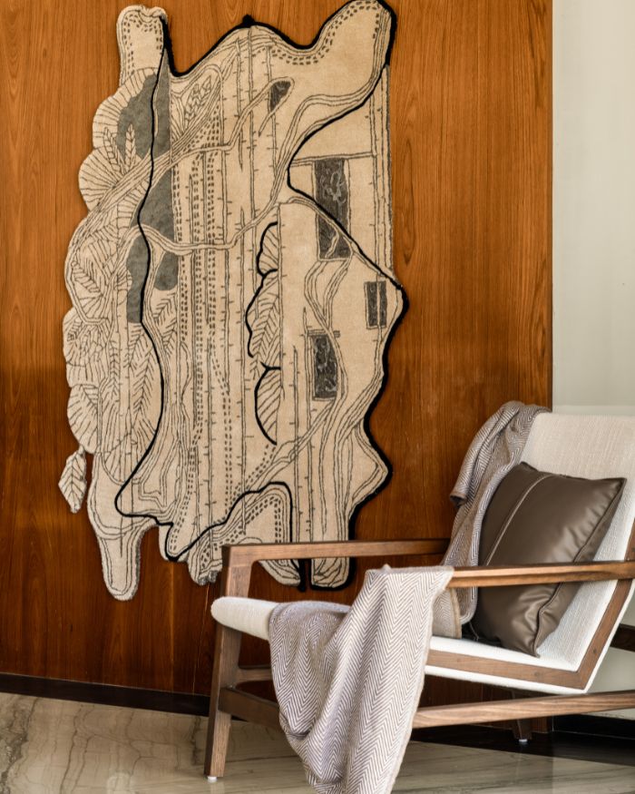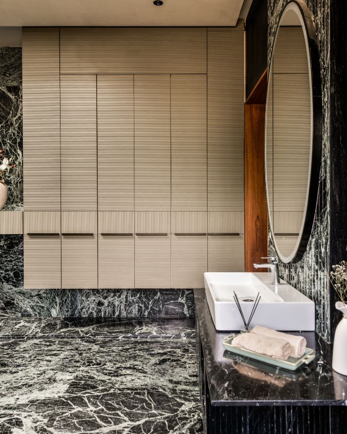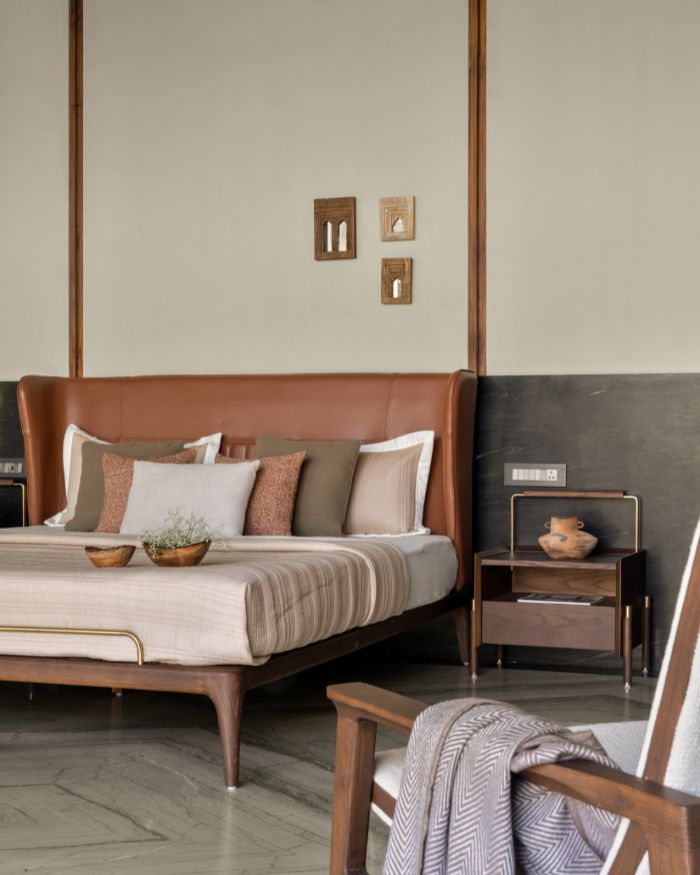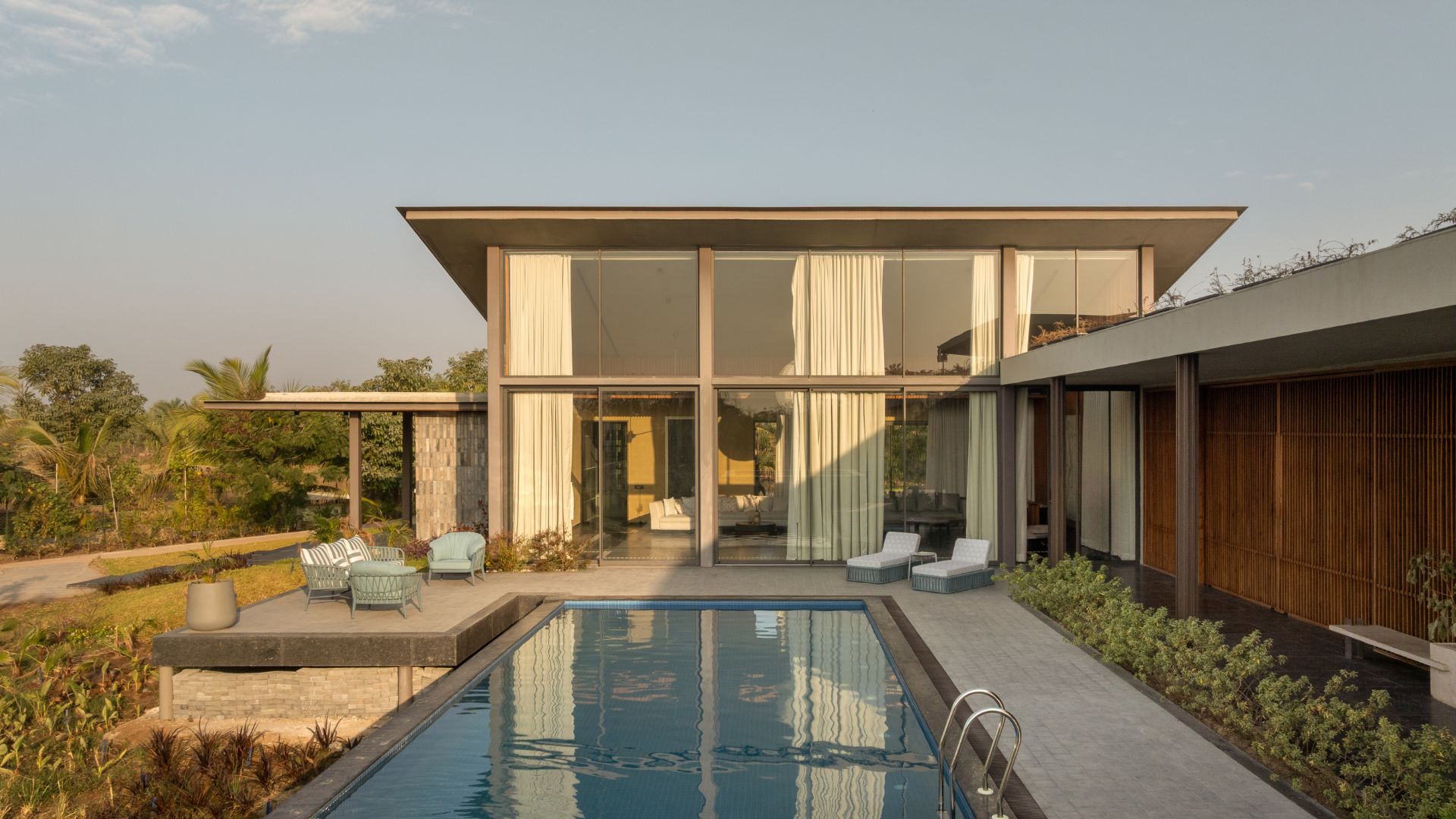 “The colour palette borrows from the surrounding forest and earth — muted greens, warm stone beiges, soft greys, and charcoal accents. These hues don't compete with nature — they quietly reflect it. Copper details, timber screens, and limewashed walls are expected to evolve over time" — Saumil and Prashant