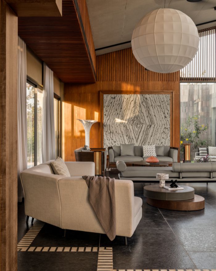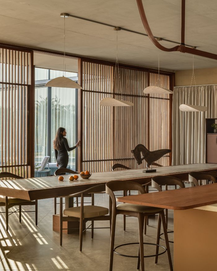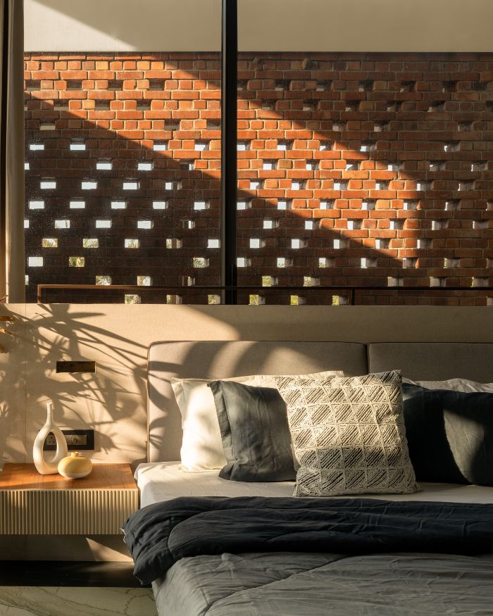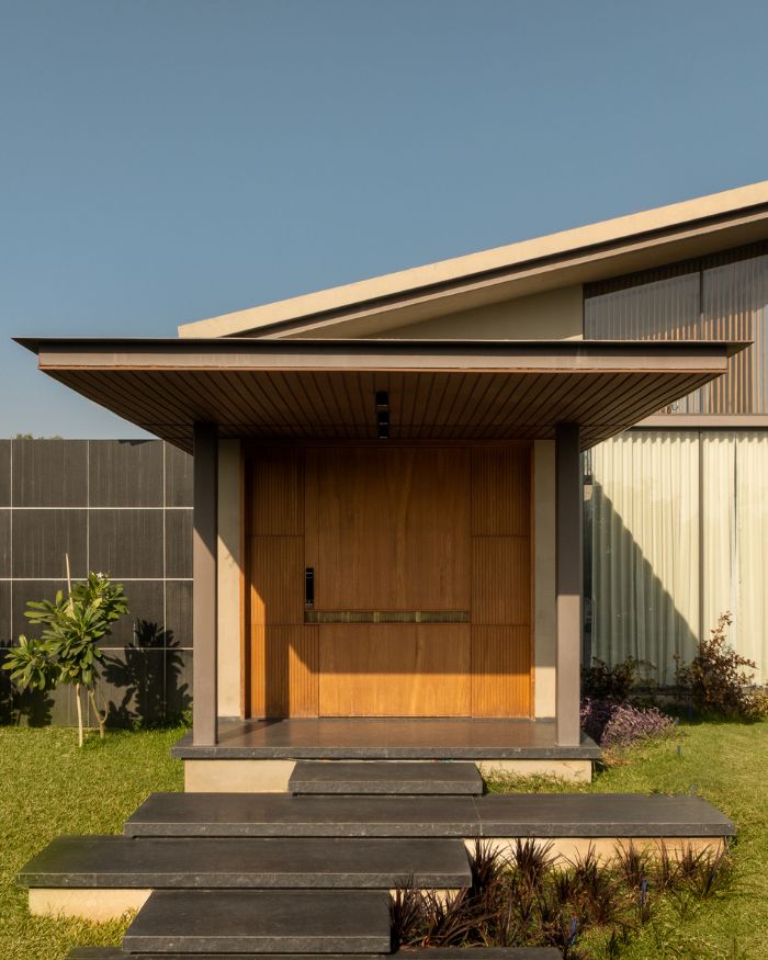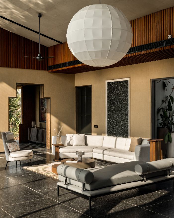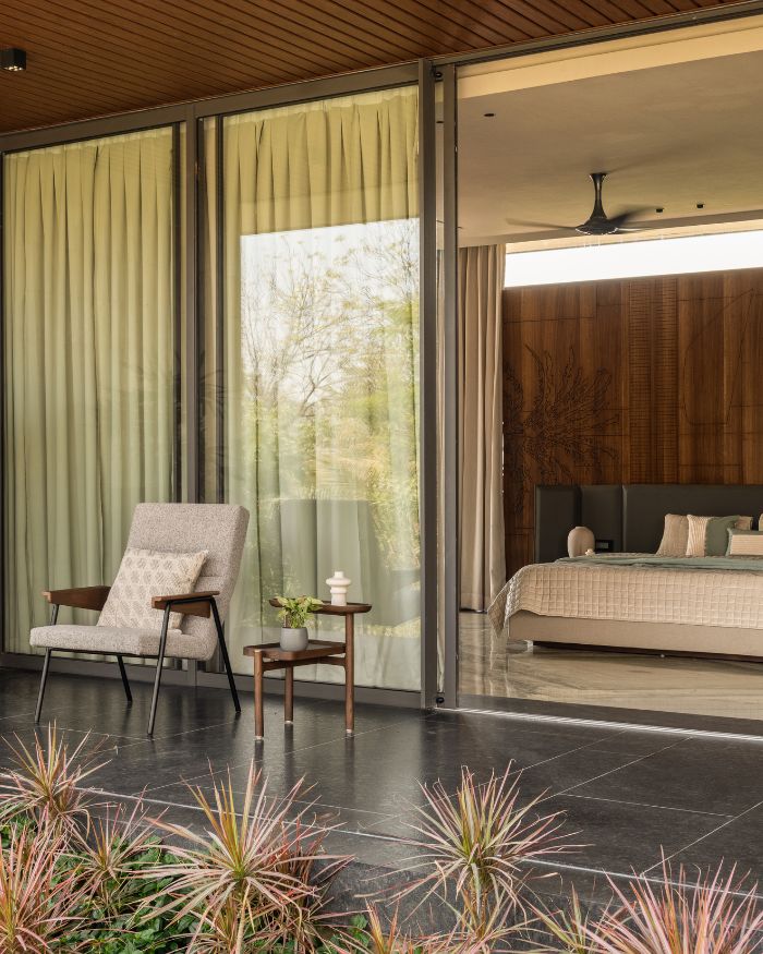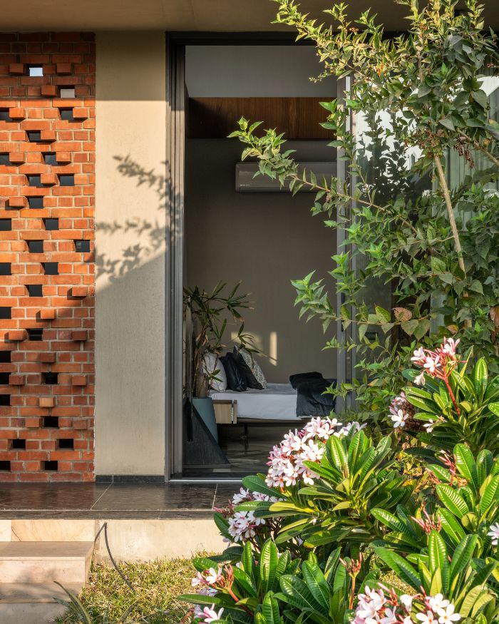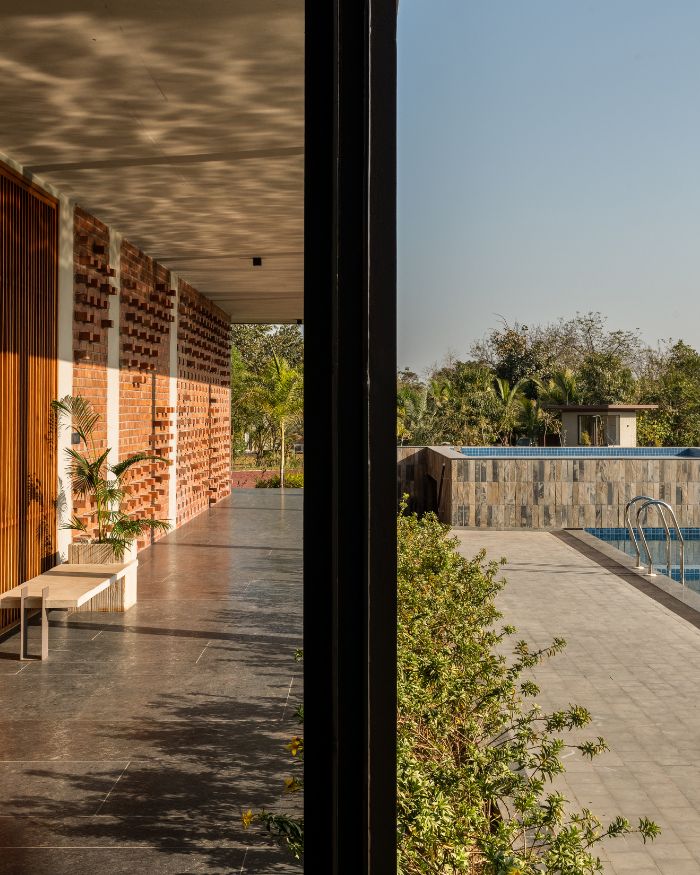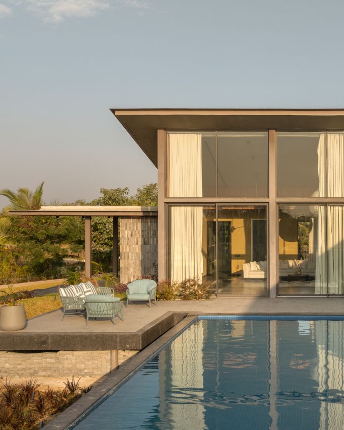 With constant cacophony surrounding us, we’re constantly looking for a home that can slow us down. Instill stillness. Centre us momentarily. Cocoon us in its architecture. Squelette Design crafts a 1,000 sq ft home in Ahmedabad, Gujarat to be that sanctuary — a weekend haven that is also a place for perennial peace. “The spatial narrative is designed to evoke daily rituals—from the quiet of early morning yoga to the late-afternoon play of light on textured stone. Architecture here becomes a frame for living with intention,” elucidate Co-Founders and Principal Architects, Saumil Patel and Prashant Trivedi, who worked for landscape design with Akshar Landscape Architects (ALA) and with Setu Infrastructure for structure design.