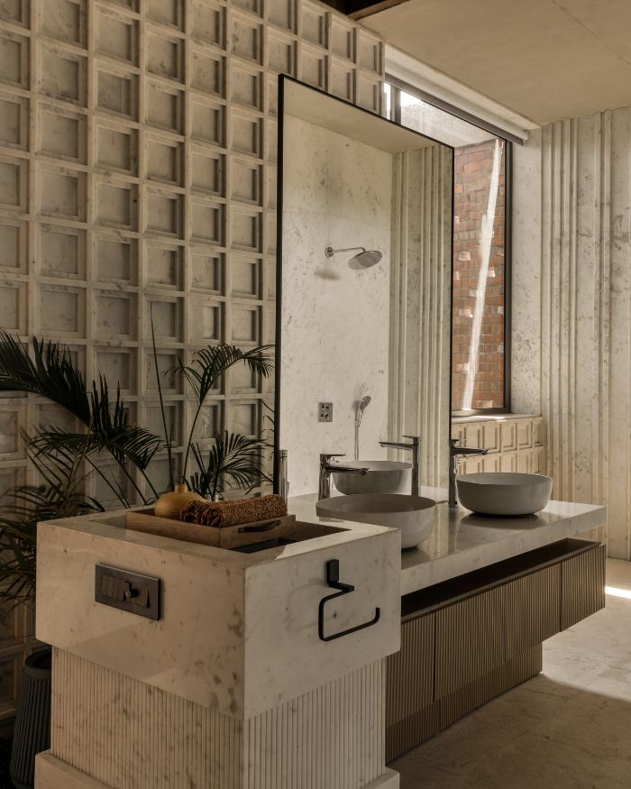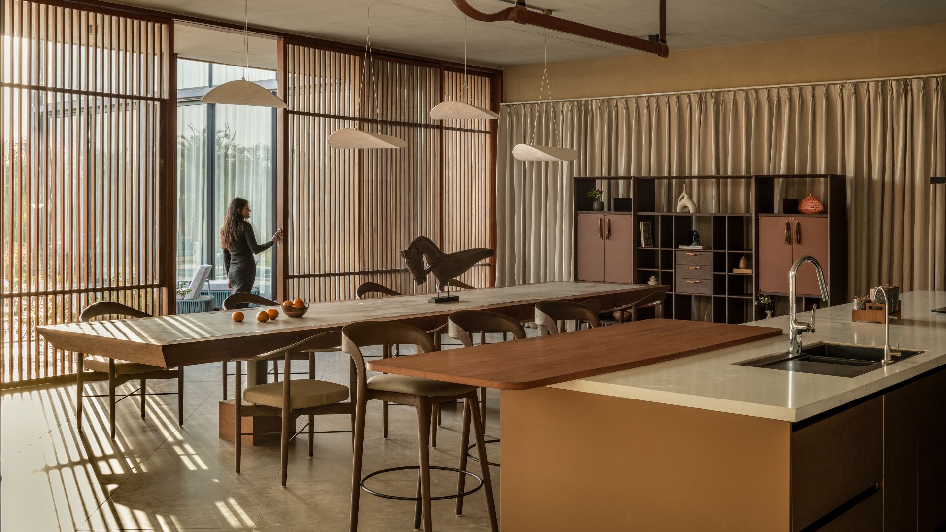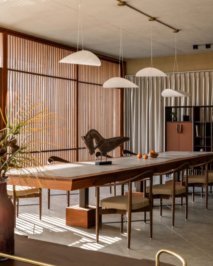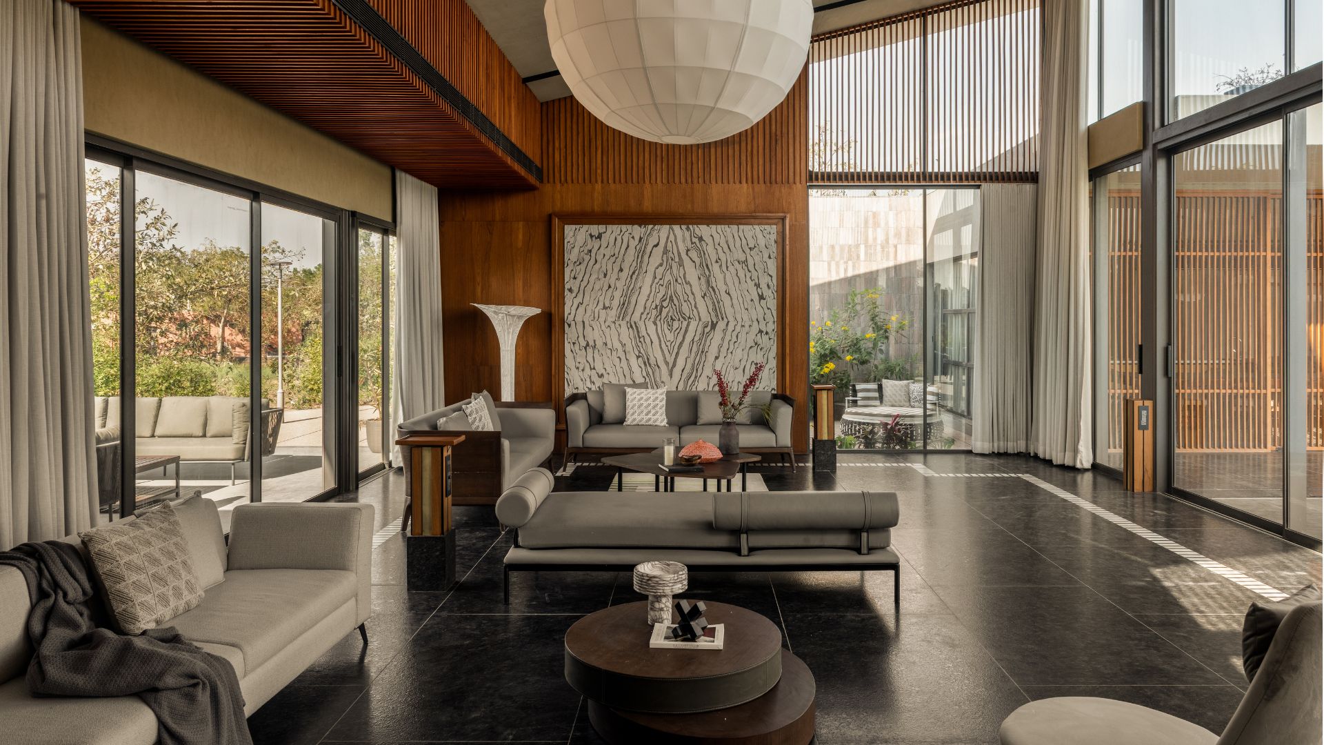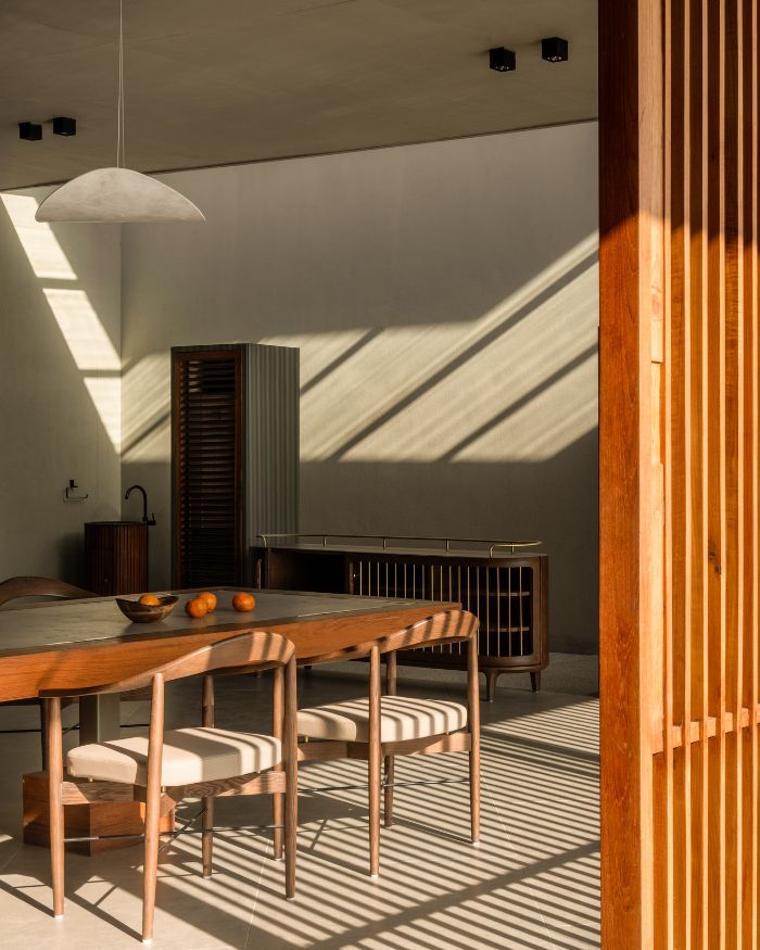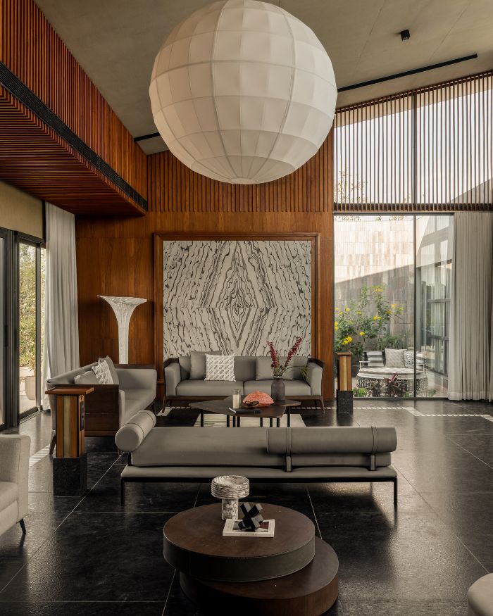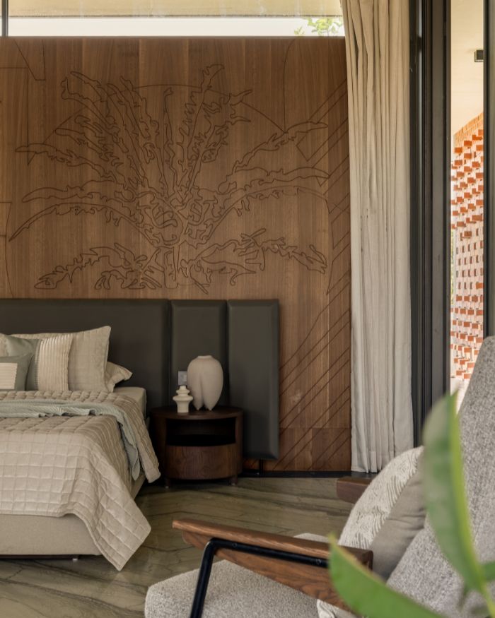 With constant cacophony surrounding us, we’re constantly looking for a home that can slow us down. Instill stillness. Centre us momentarily. Cocoon us in its architecture. Squelette Design crafts a 1,000 sq ft home in Ahmedabad, Gujarat to be that sanctuary — a weekend haven that is also a place for perennial peace. “The spatial narrative is designed to evoke daily rituals—from the quiet of early morning yoga to the late-afternoon play of light on textured stone. Architecture here becomes a frame for living with intention,” elucidate Co-Founders and Principal Architects, Saumil Patel and Prashant Trivedi, who worked for landscape design with Akshar Landscape Architects (ALA) and with Setu Infrastructure for structure design.