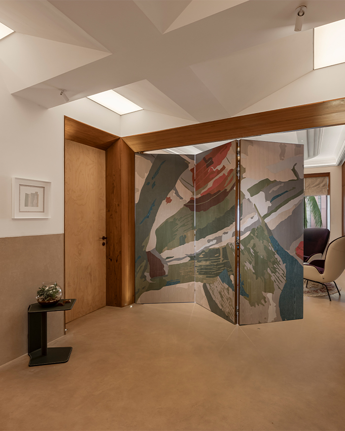 Anchored beneath roshandaans, rebranded in the vernacular, skylights, this 2,500 sq ft space is located inside a landmark Art Deco structure dating back to the late 1930s. With lofty proportions untouched for nearly five decades, the residence is indomitable and the homeowners placed complete trust in Pravir Sethi, Principal Architect of Studio Hinge, alongside Chintan Zalavadiya and Tripti Sahni who steadily brought back a renewed life into this home.